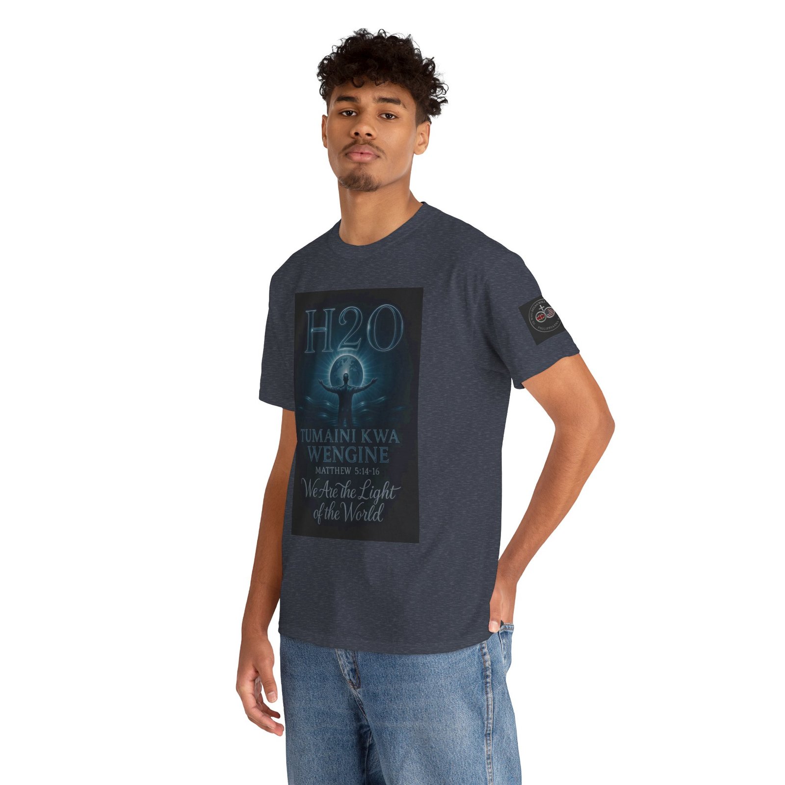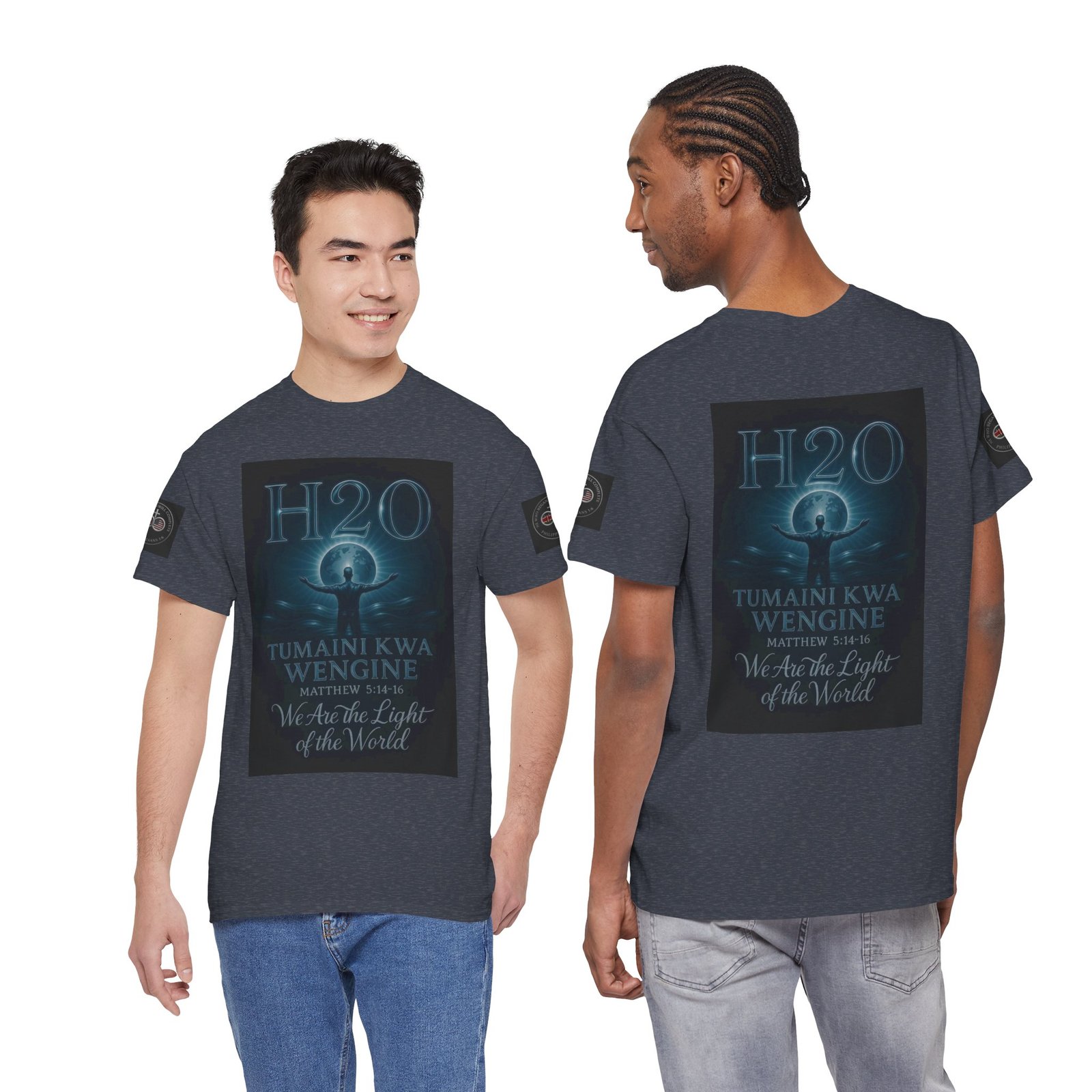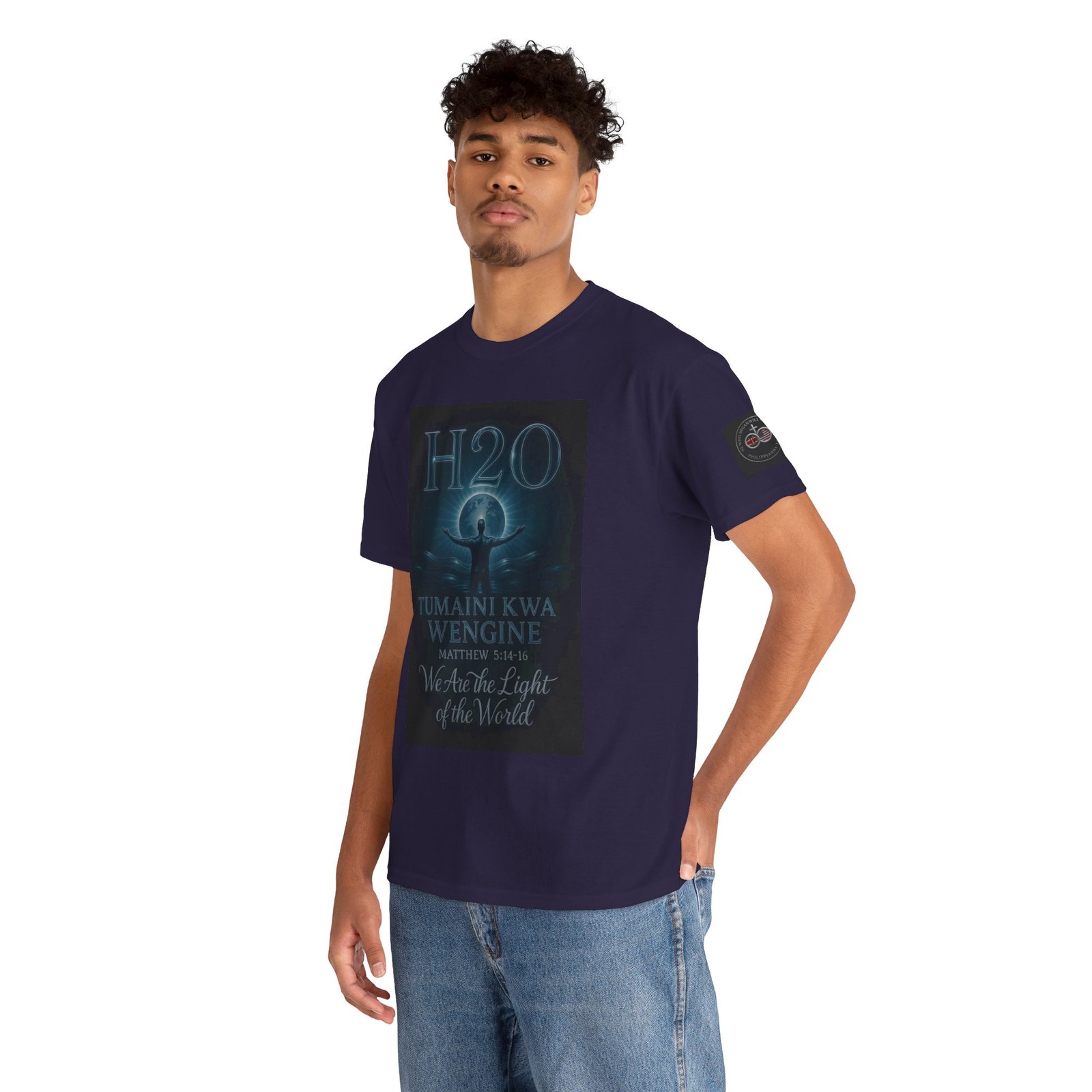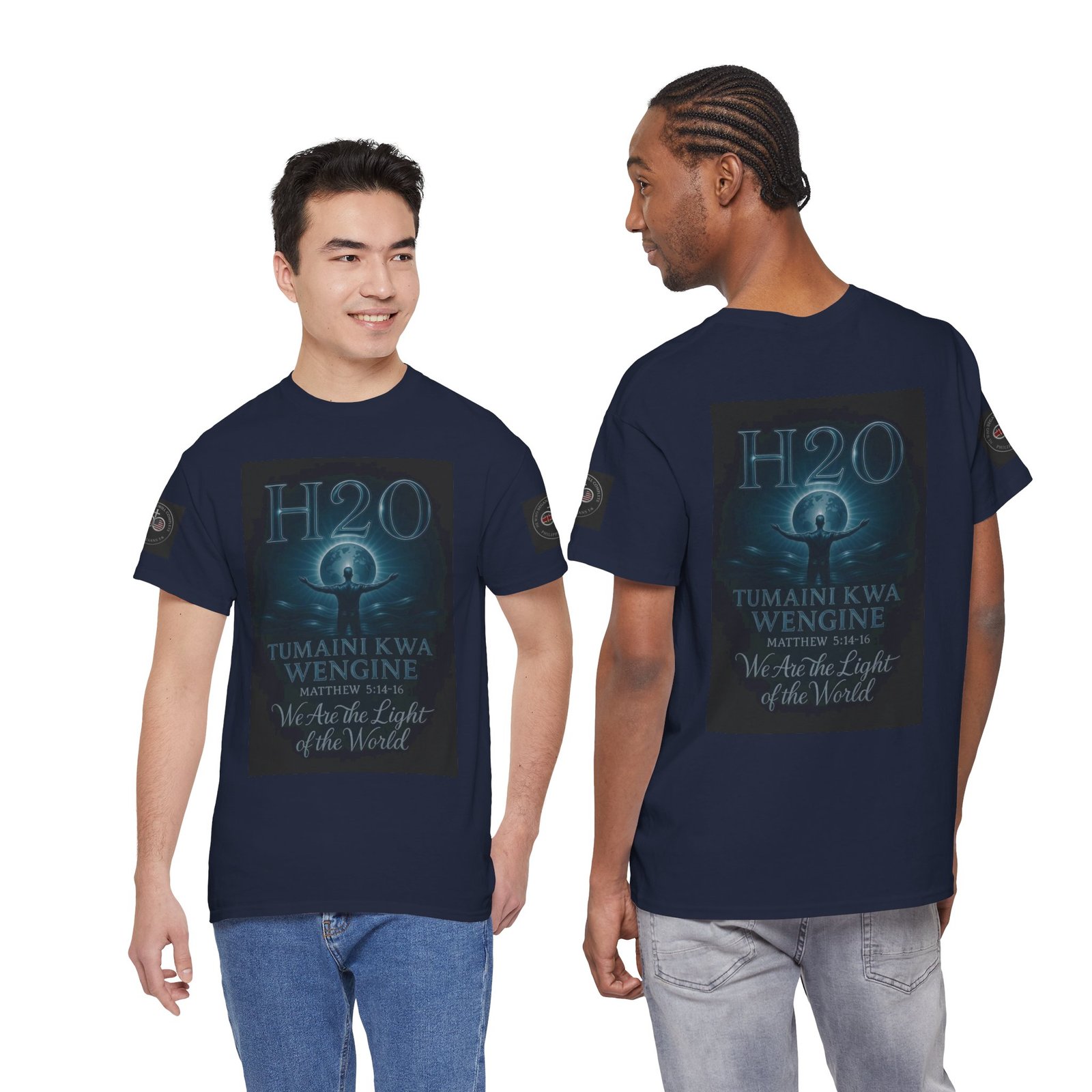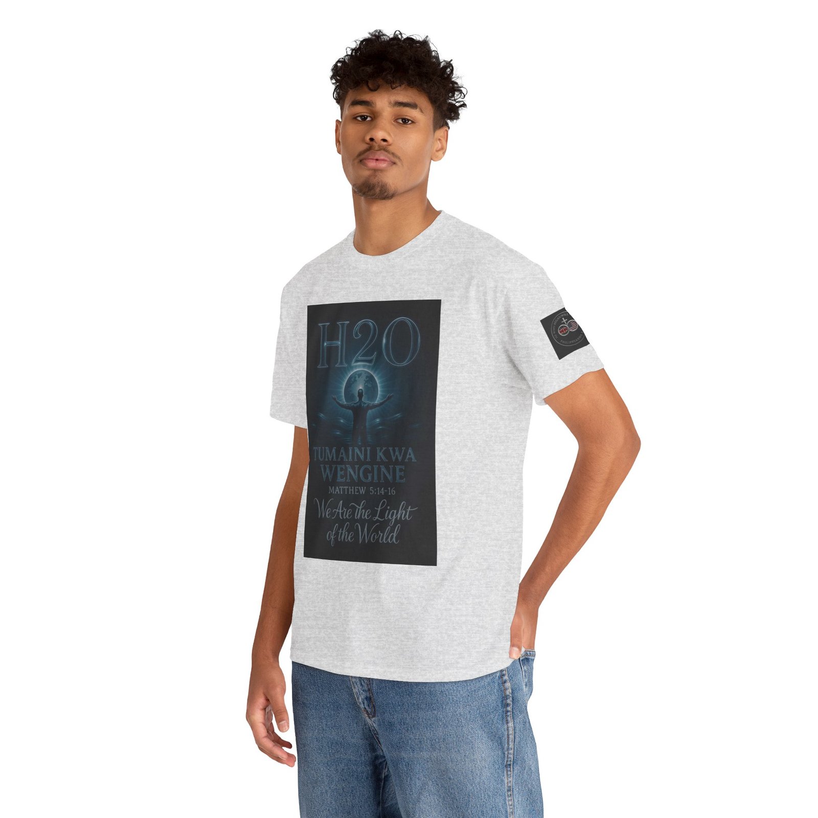 This breathable, classic-fit tee carries a quiet, purposeful message: H2O and a call to be “the light of the world.” The soft, slightly textured cotton feels substantial without weighing you down. A deep, blue-toned poster-style print sits front and center, with the same artwork echoed on the back — a subtle echo for anyone who lives by values and wants their clothing to speak without shouting. Wear it layered under a jacket for evening outreach or on warm days when you want a comfortable shirt that reflects conviction and calm. The clean crewneck and tear-away label keep the focus on the message and the moment, not on fussing with your clothes.