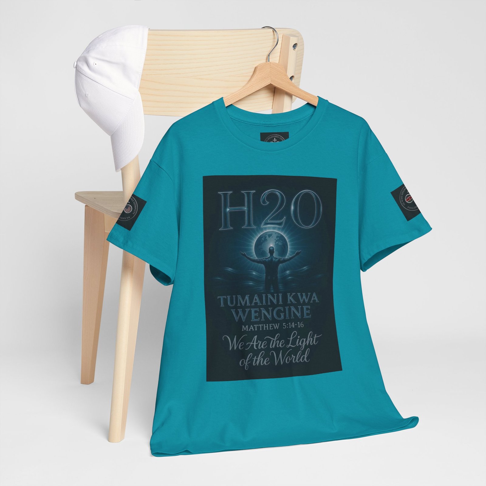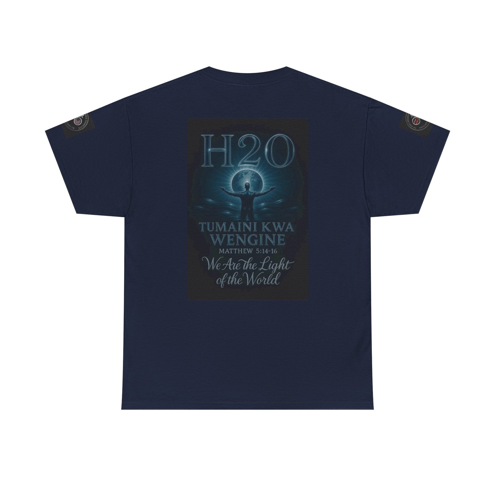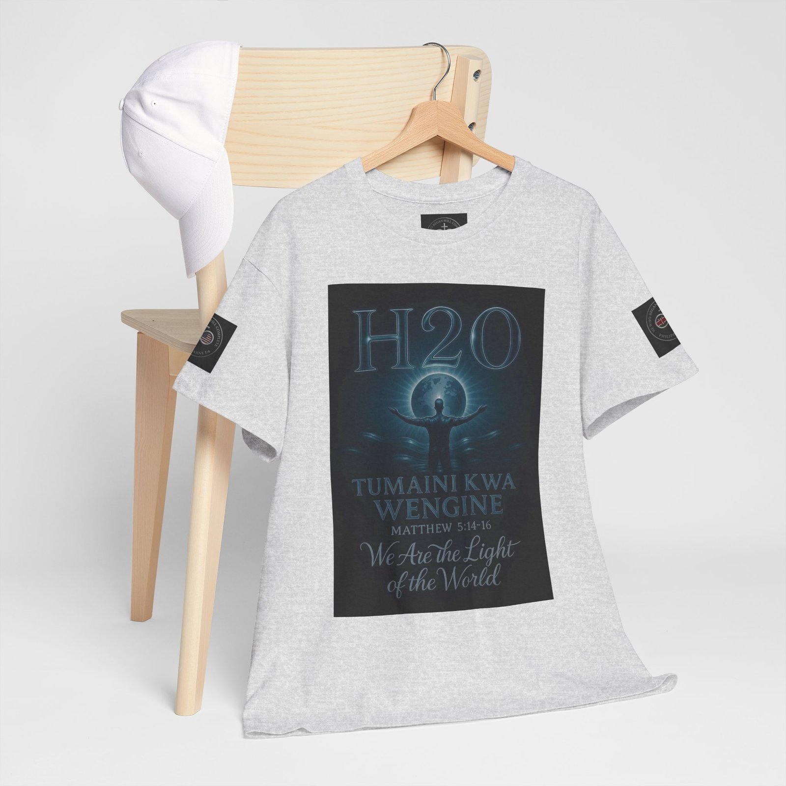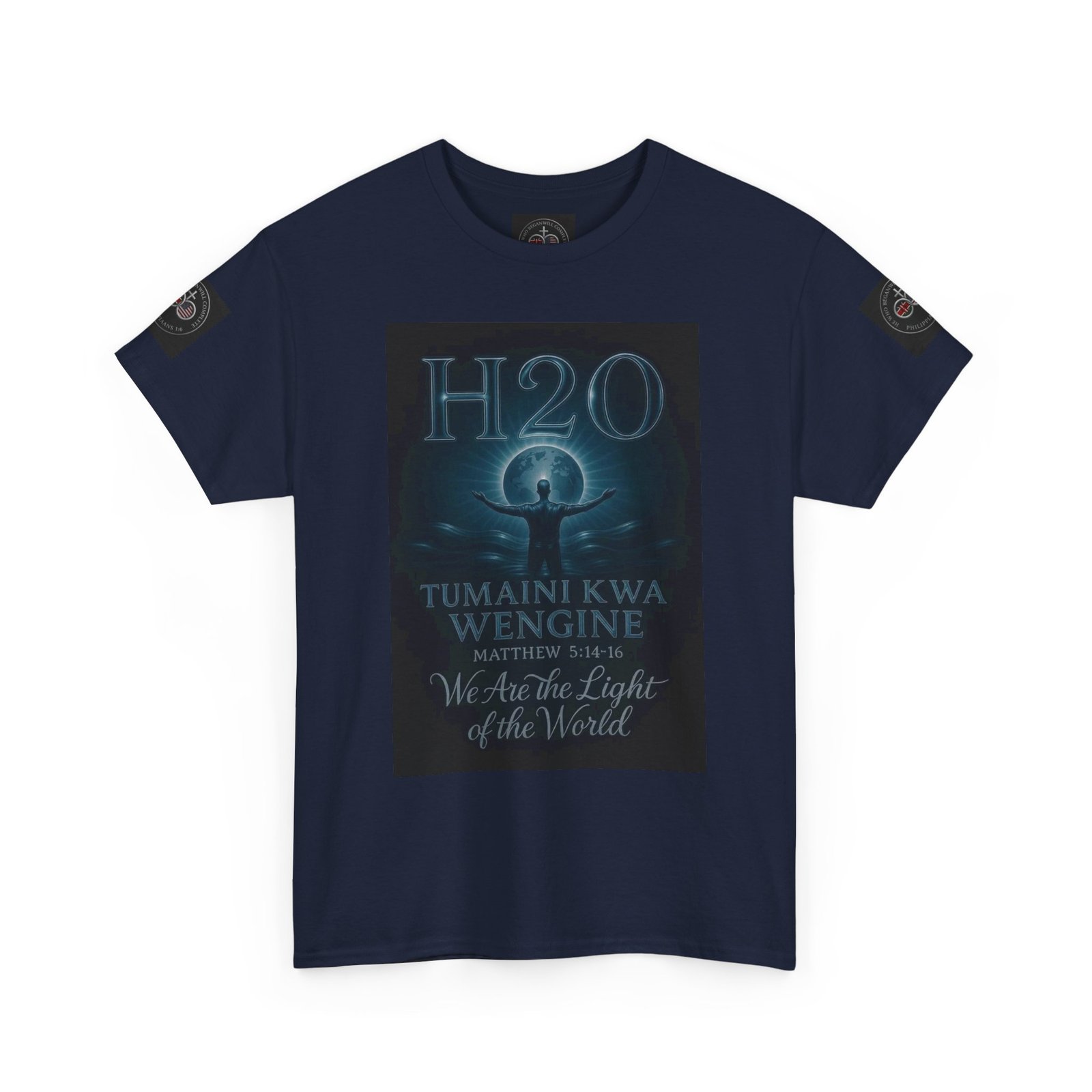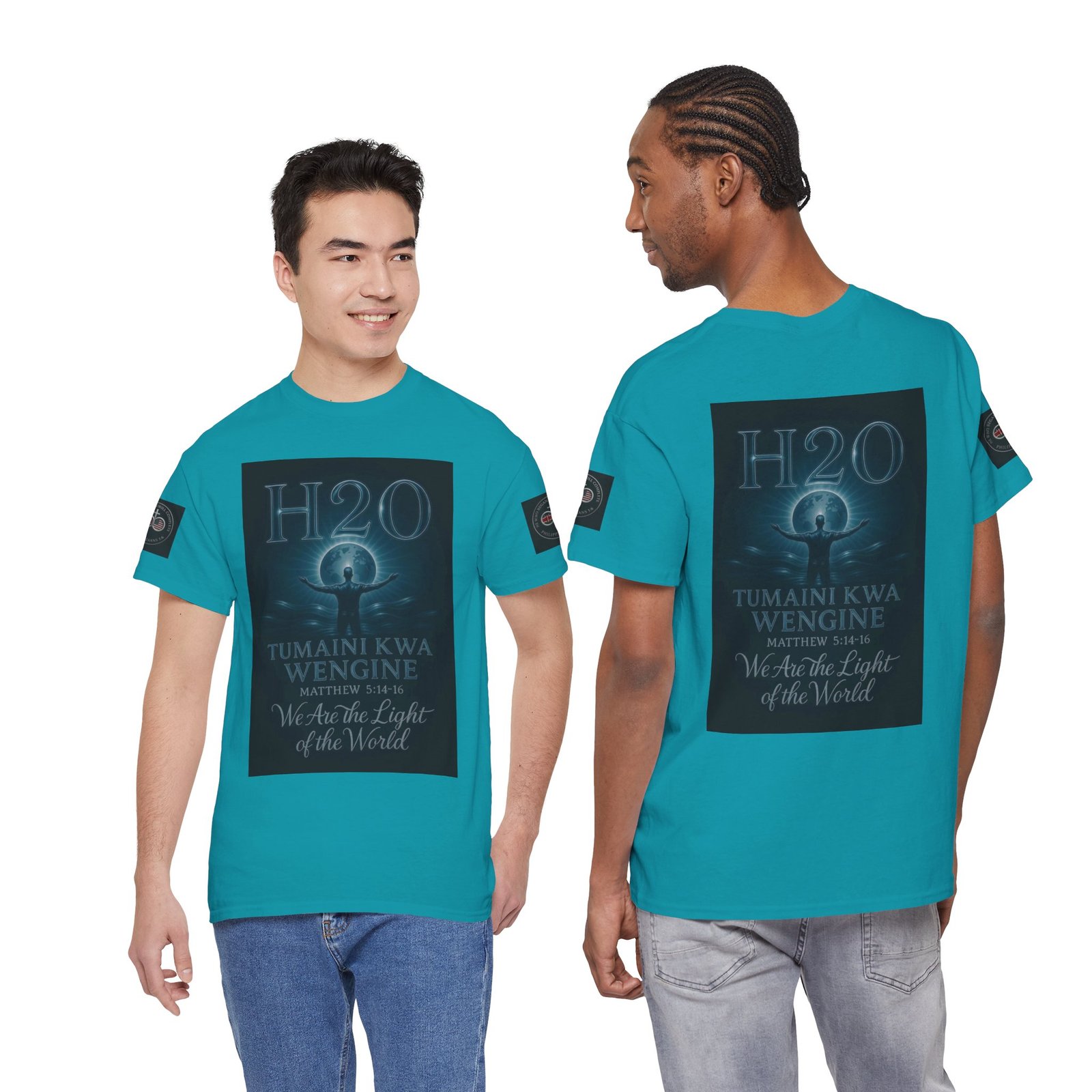This breathable, classic-fit tee carries a quiet, purposeful message: H2O and a call to be “the light of the world.” The soft, slightly textured cotton feels substantial without weighing you down. A deep, blue-toned poster-style print sits front and center, with the same artwork echoed on the back — a subtle echo for anyone who lives by values and wants their clothing to speak without shouting. Wear it layered under a jacket for evening outreach or on warm days when you want a comfortable shirt that reflects conviction and calm. The clean crewneck and tear-away label keep the focus on the message and the moment, not on fussing with your clothes.