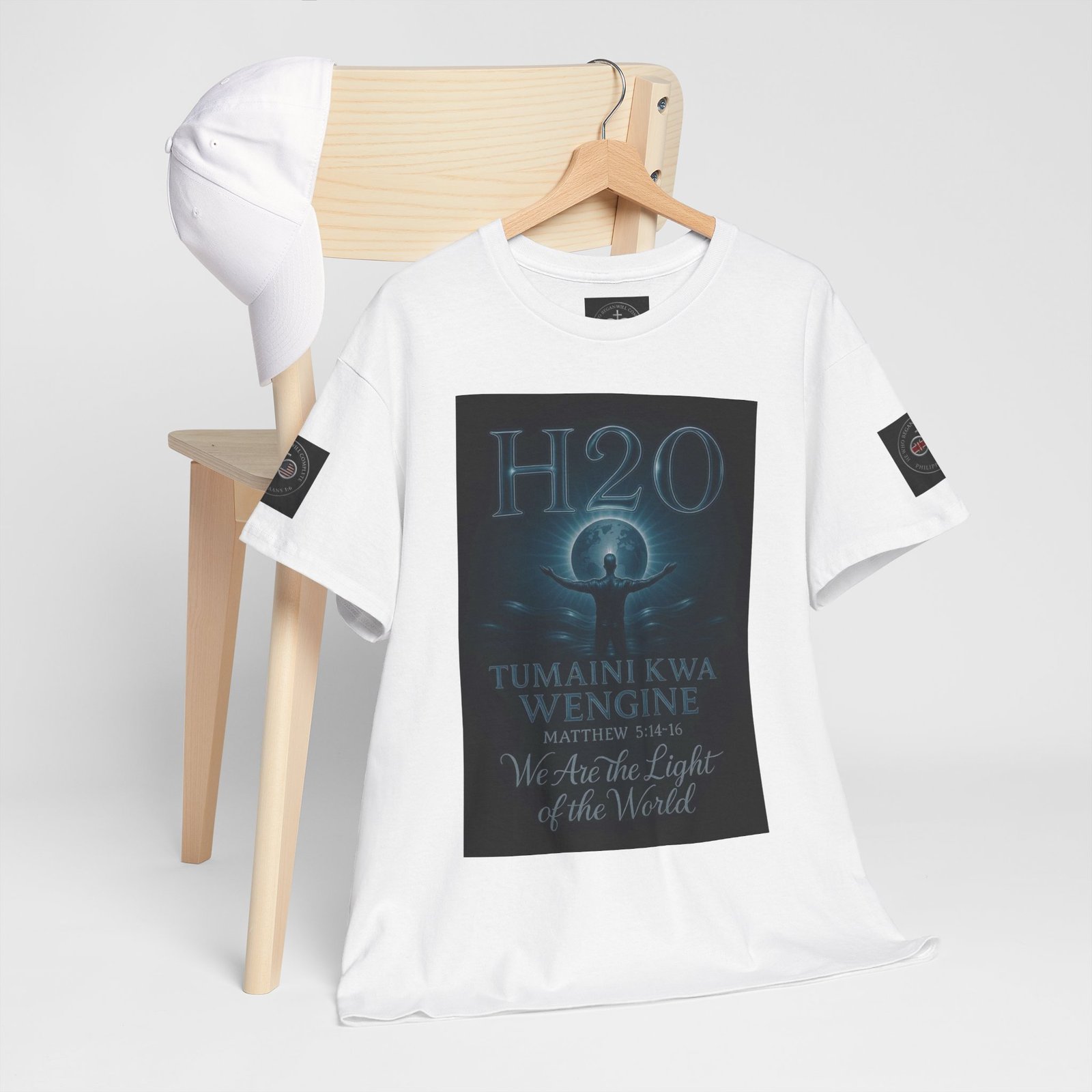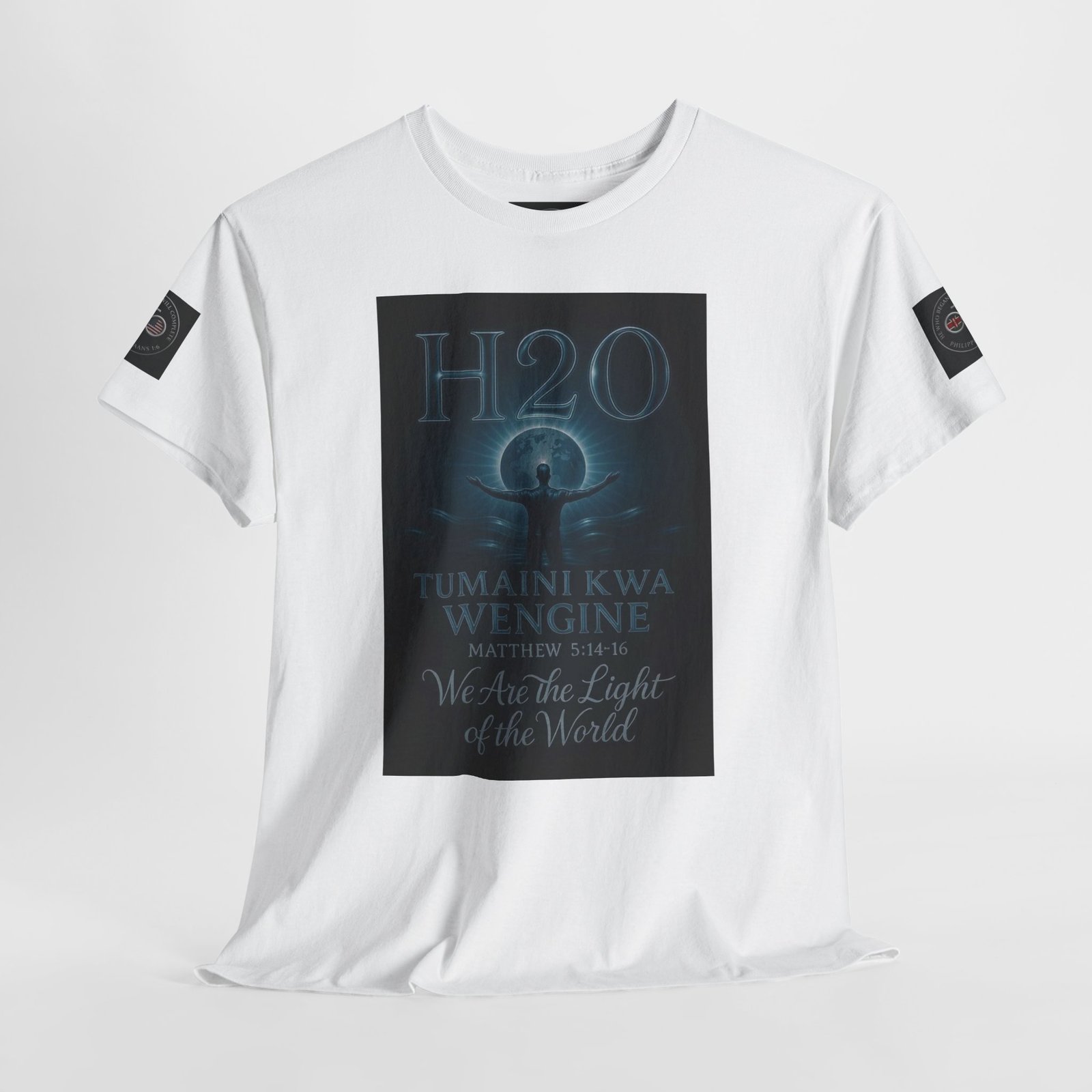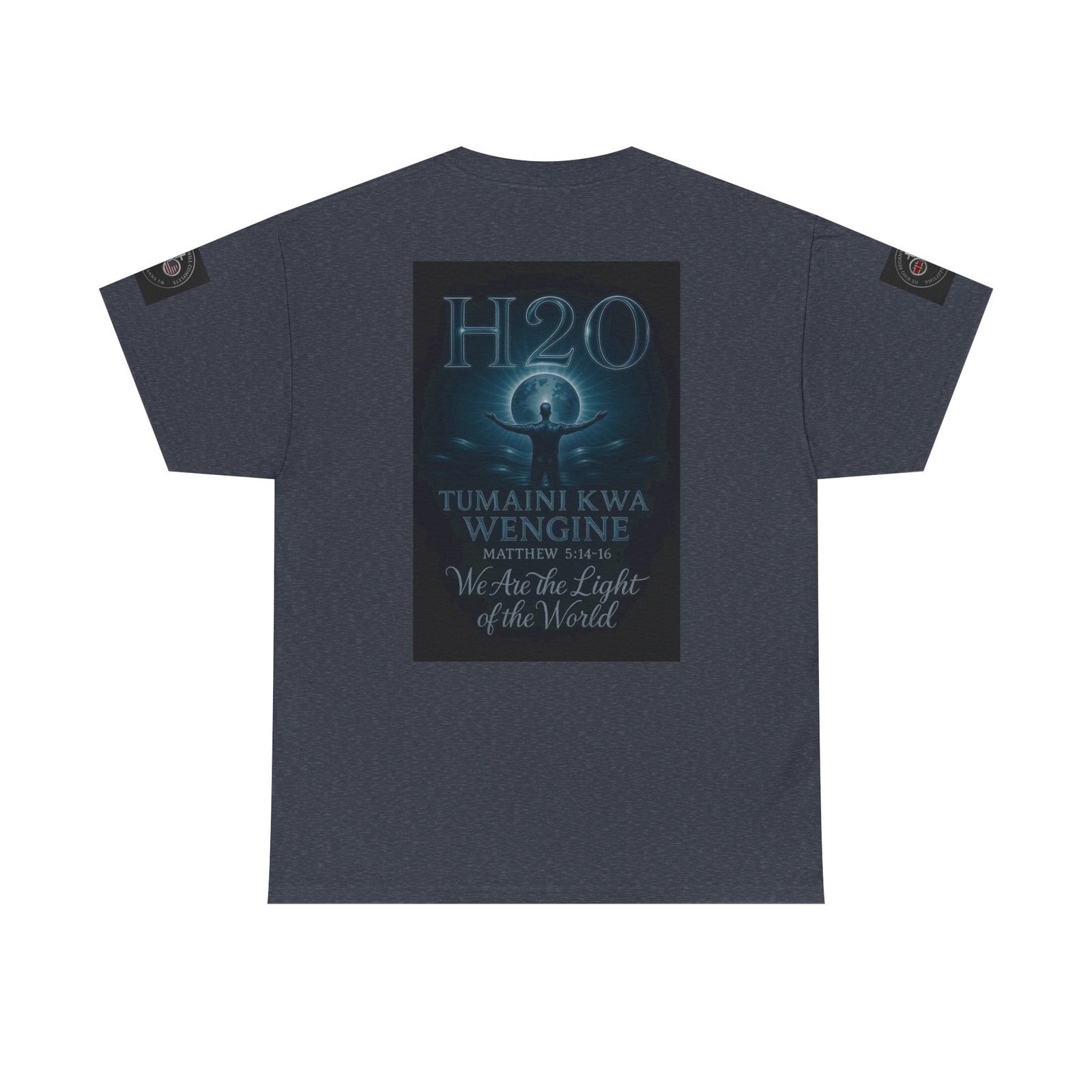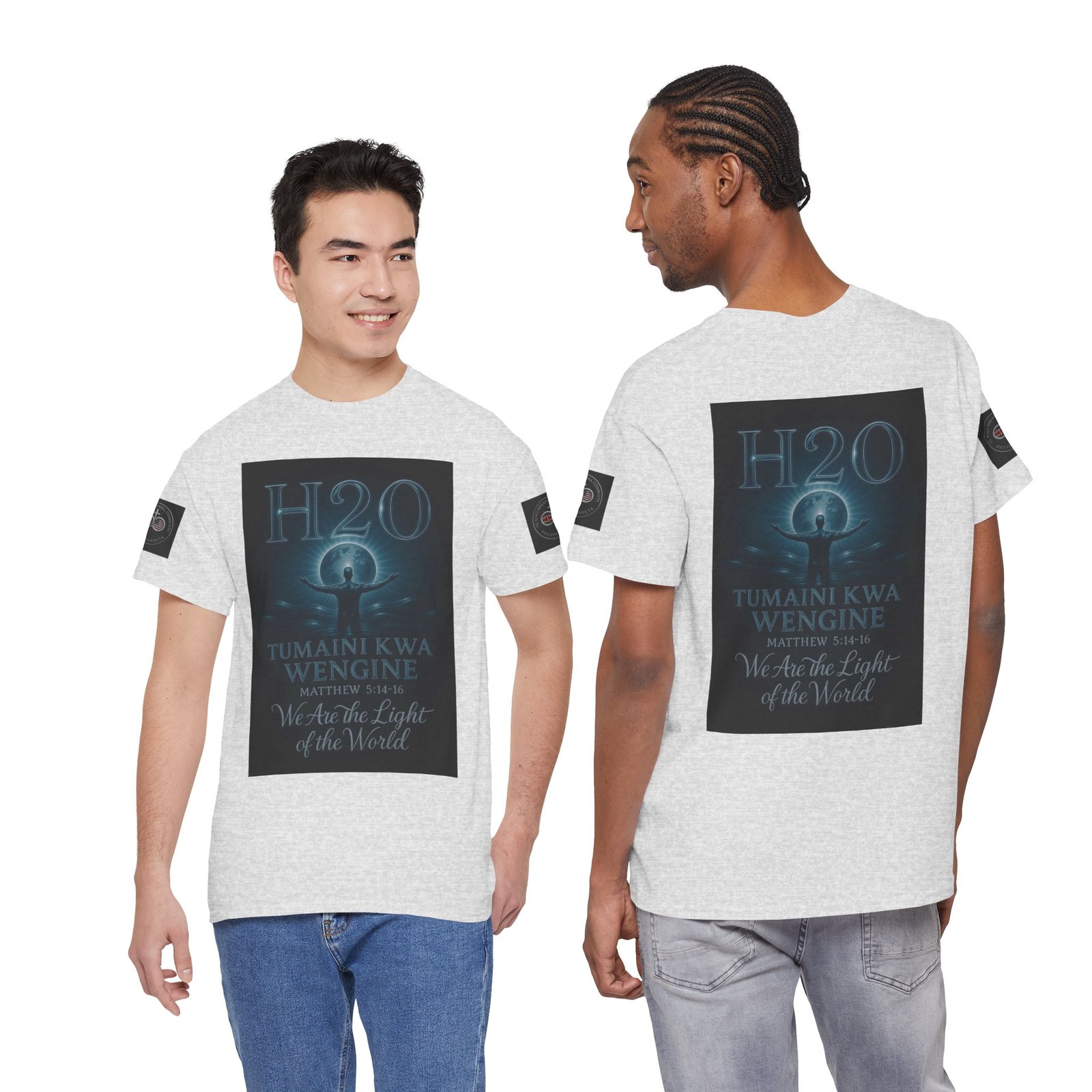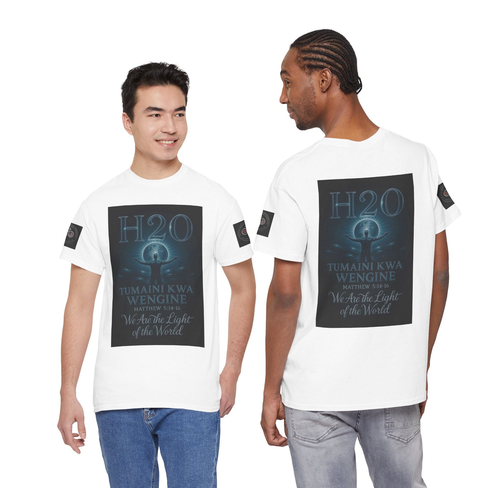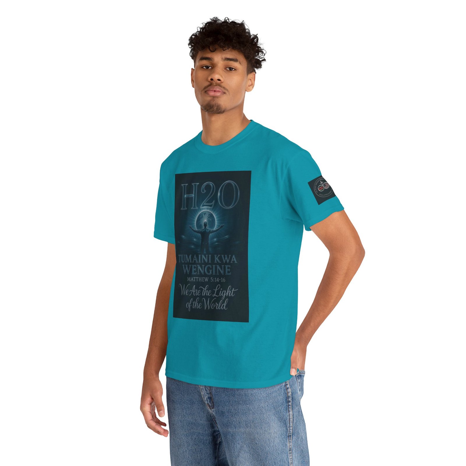 This breathable, classic-fit tee carries a quiet, purposeful message: H2O and a call to be “the light of the world.” The soft, slightly textured cotton feels substantial without weighing you down. A deep, blue-toned poster-style print sits front and center, with the same artwork echoed on the back — a subtle echo for anyone who lives by values and wants their clothing to speak without shouting. Wear it layered under a jacket for evening outreach or on warm days when you want a comfortable shirt that reflects conviction and calm. The clean crewneck and tear-away label keep the focus on the message and the moment, not on fussing with your clothes.