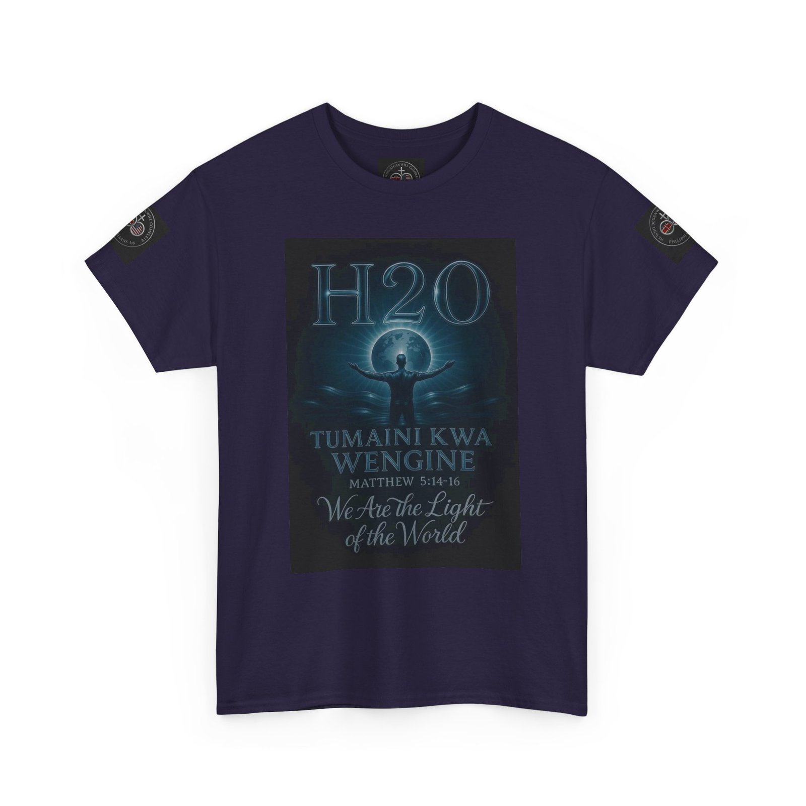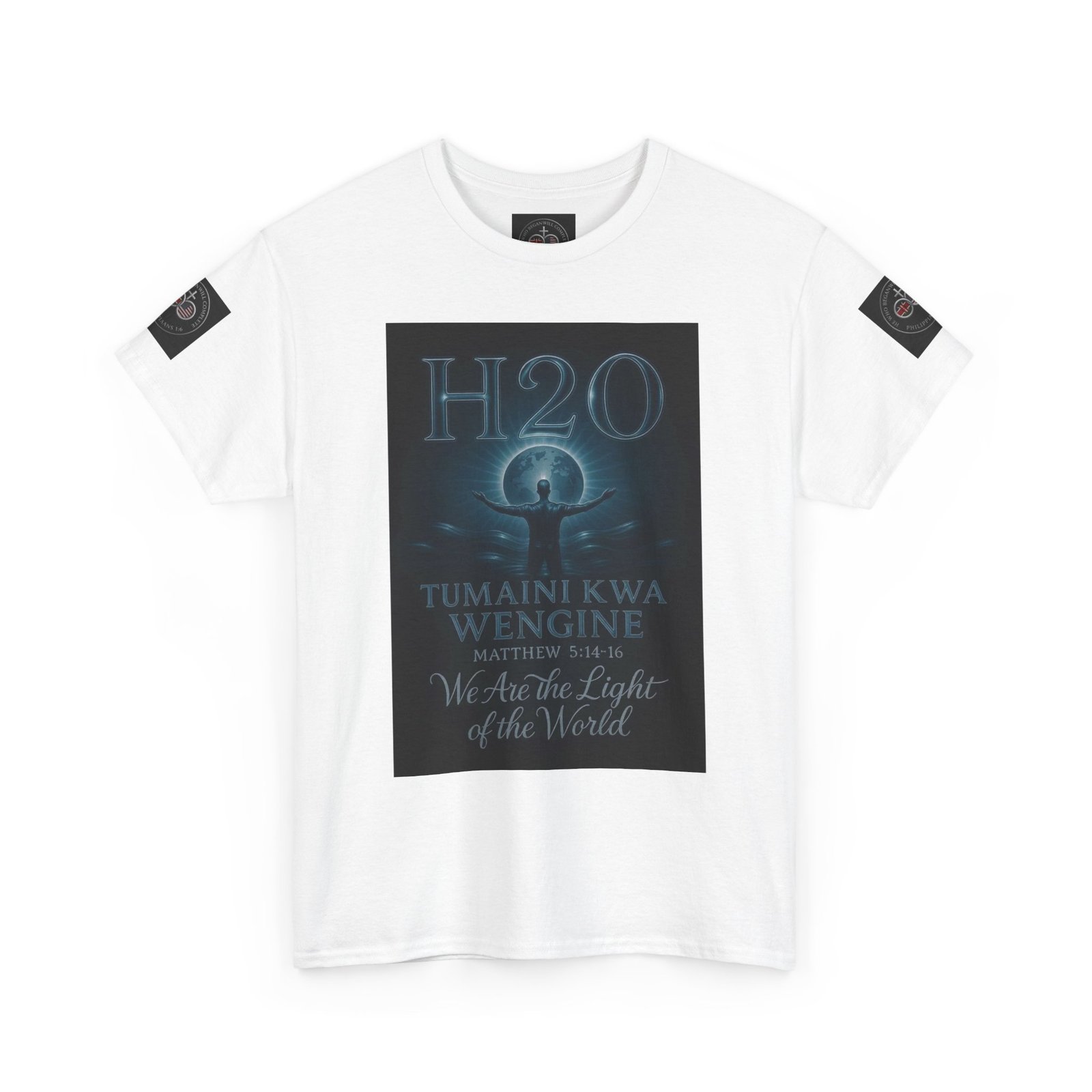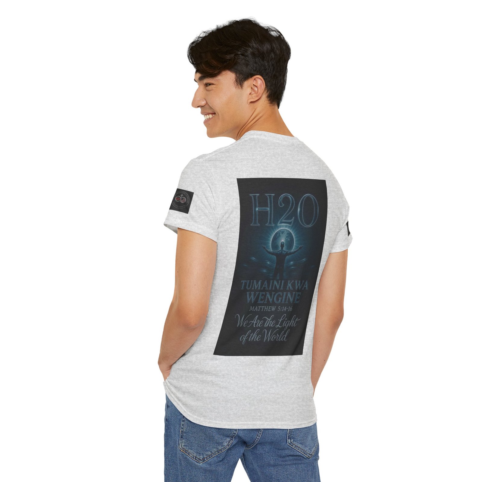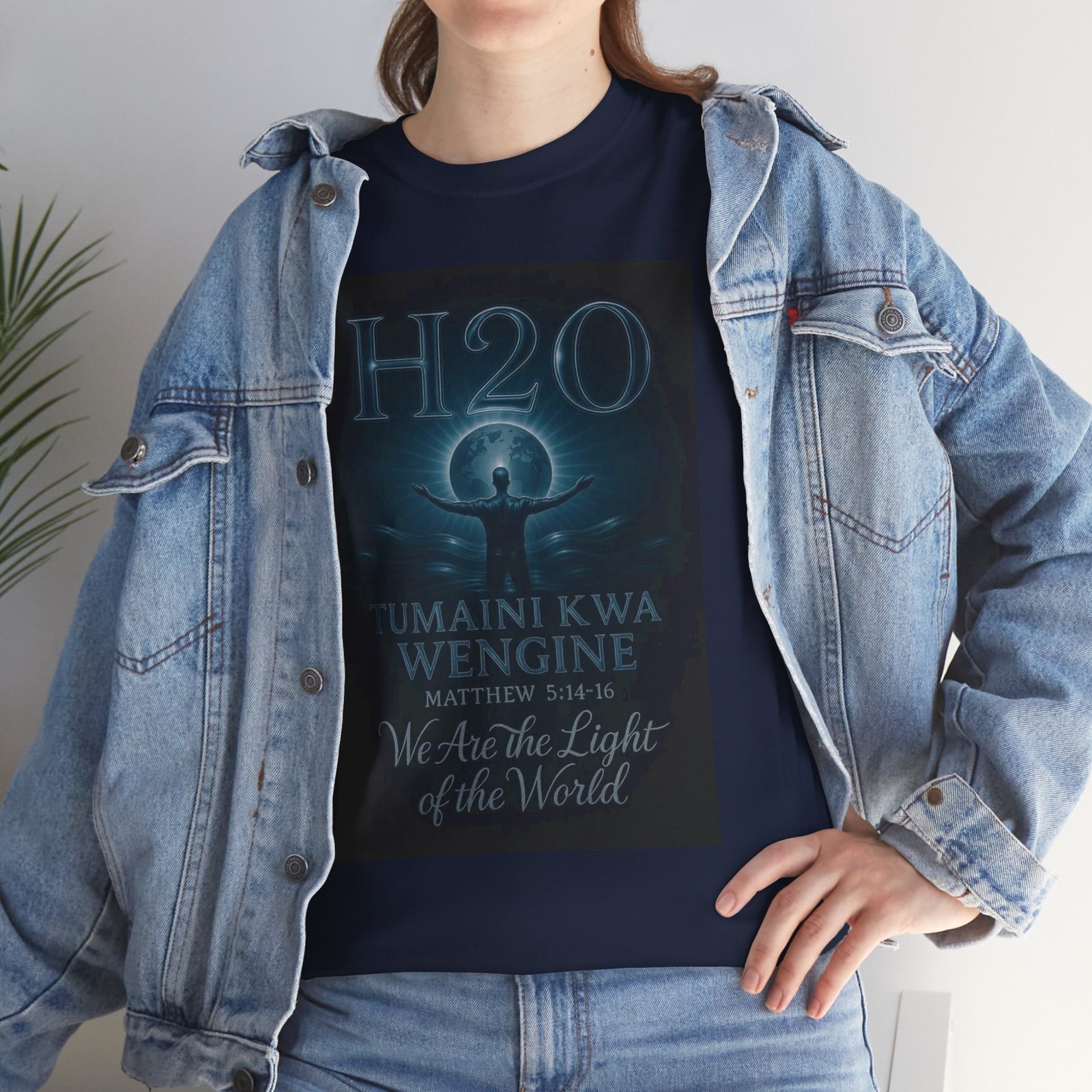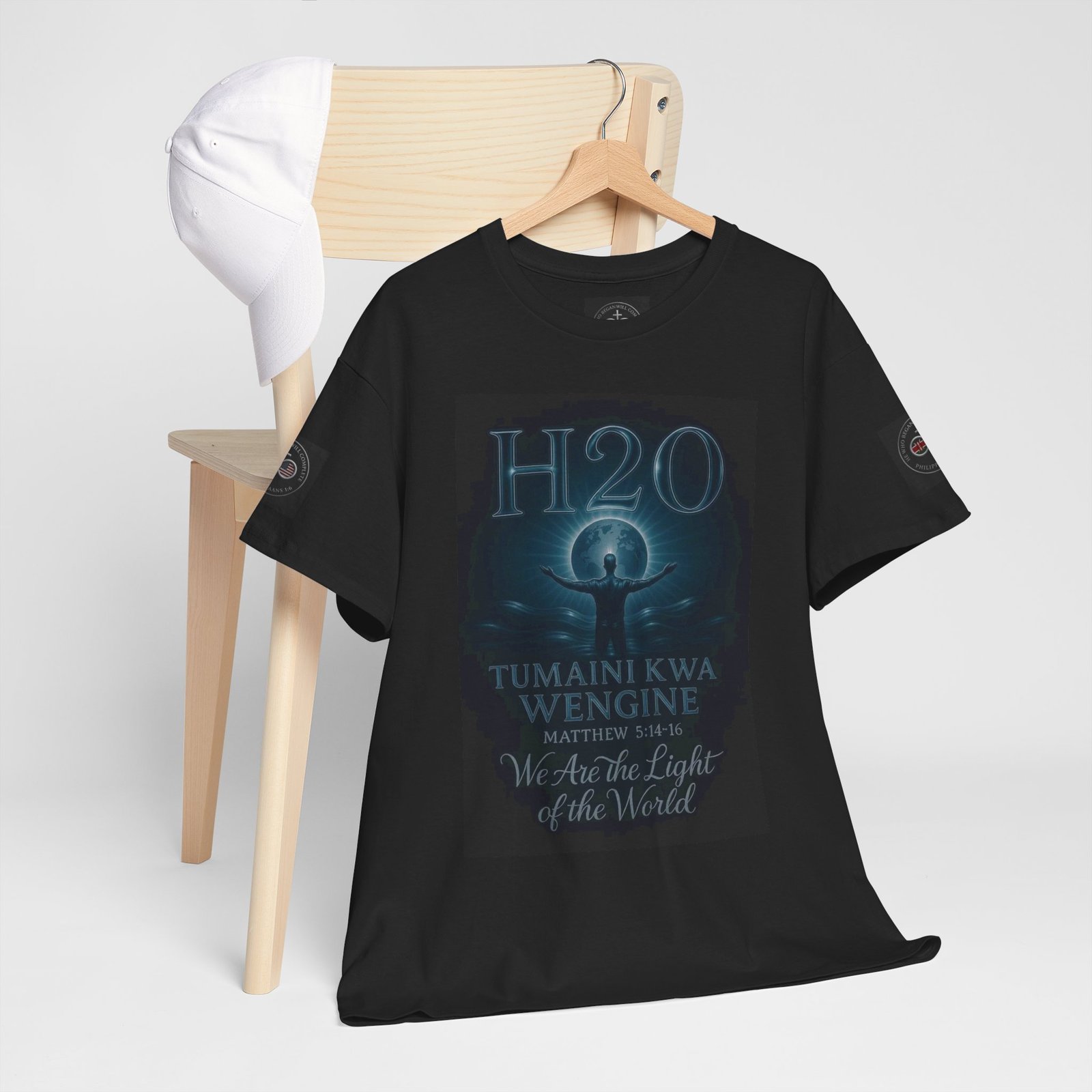 This breathable, classic-fit tee carries a quiet, purposeful message: H2O and a call to be “the light of the world.” The soft, slightly textured cotton feels substantial without weighing you down. A deep, blue-toned poster-style print sits front and center, with the same artwork echoed on the back — a subtle echo for anyone who lives by values and wants their clothing to speak without shouting. Wear it layered under a jacket for evening outreach or on warm days when you want a comfortable shirt that reflects conviction and calm. The clean crewneck and tear-away label keep the focus on the message and the moment, not on fussing with your clothes.
