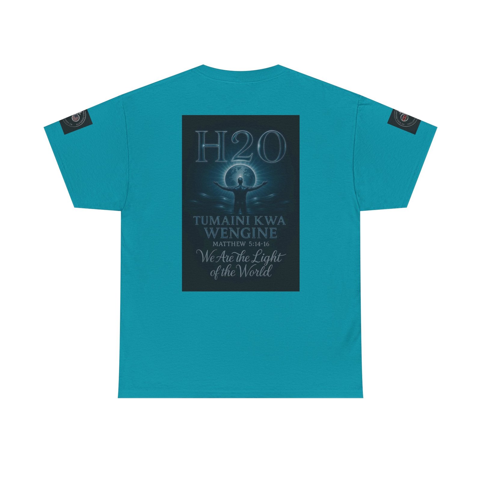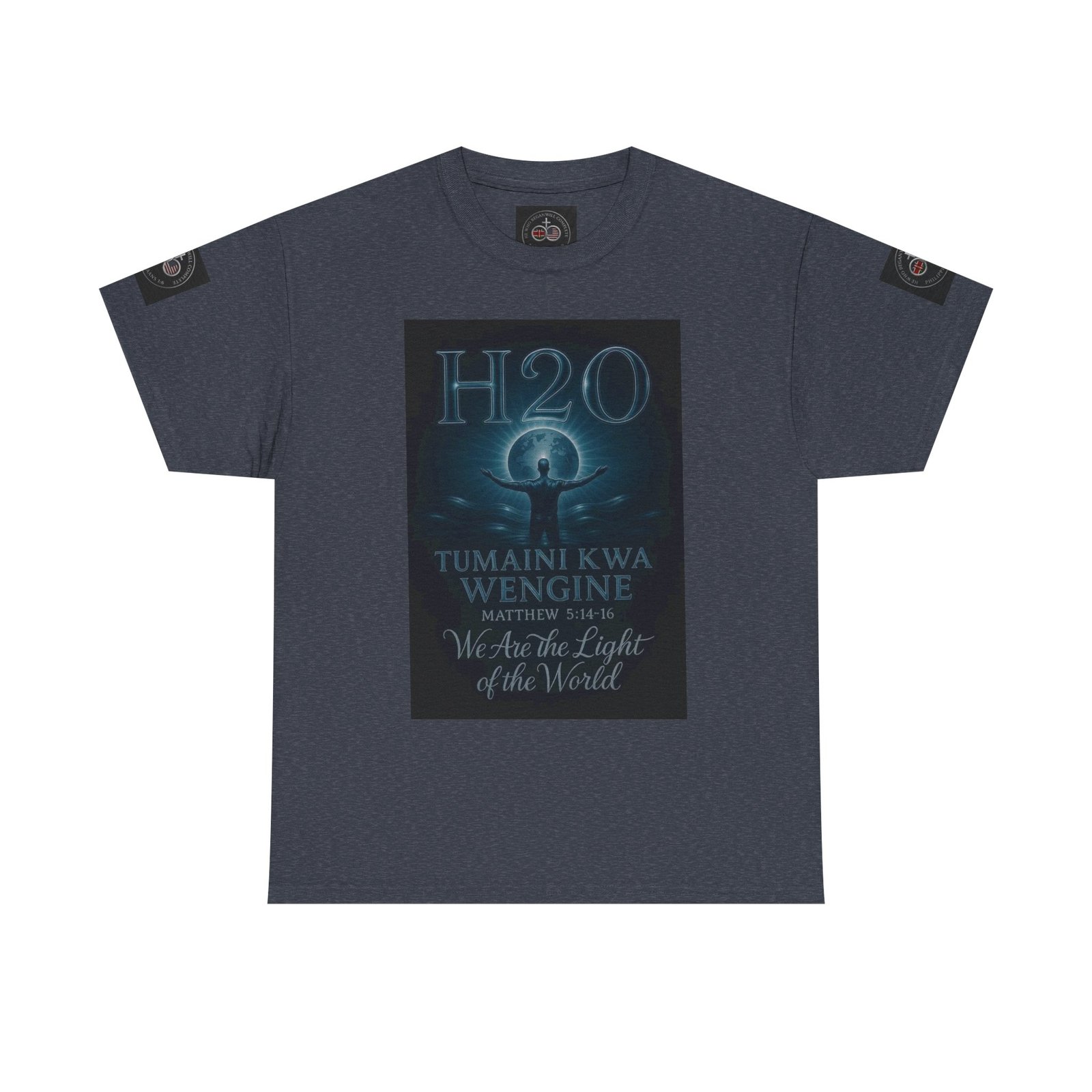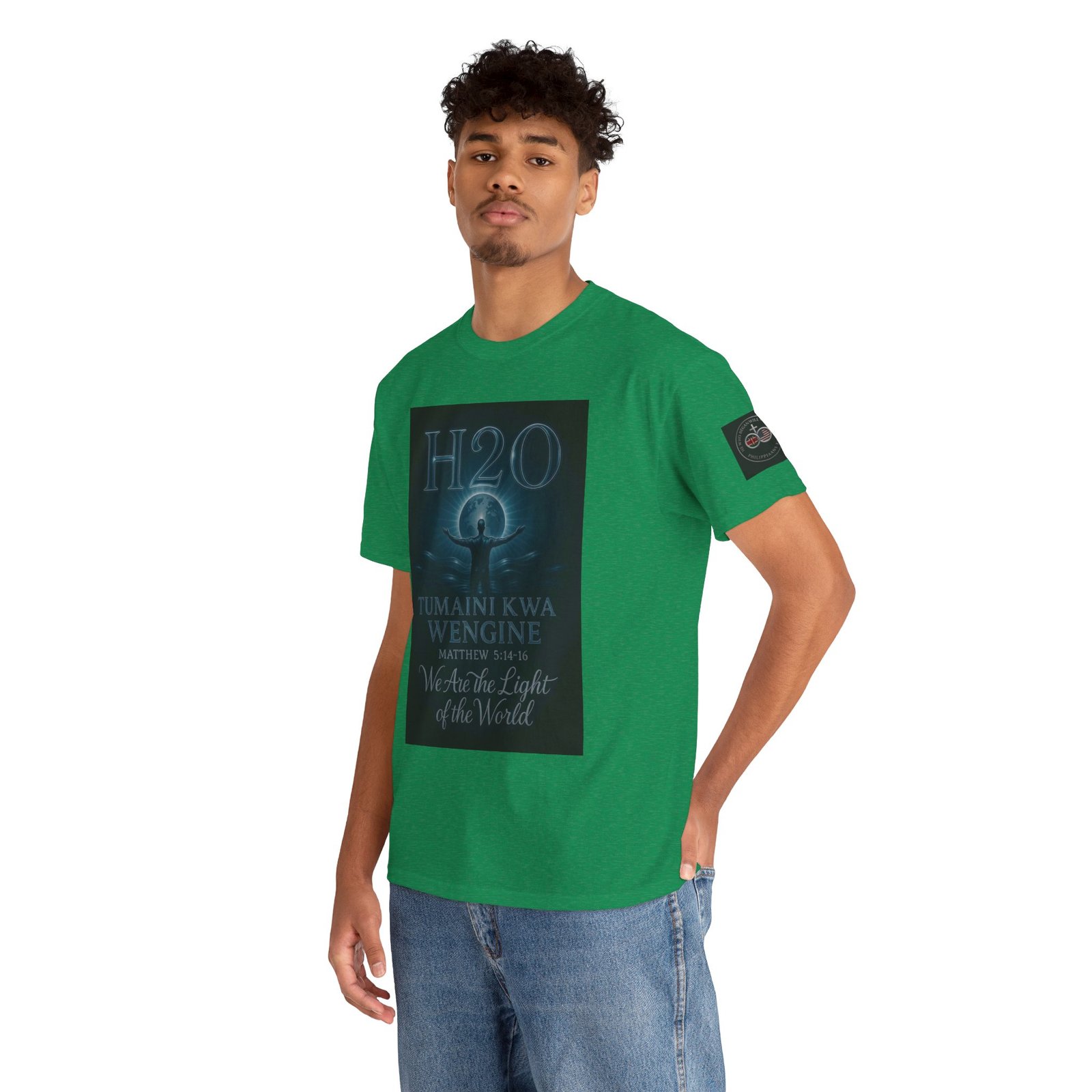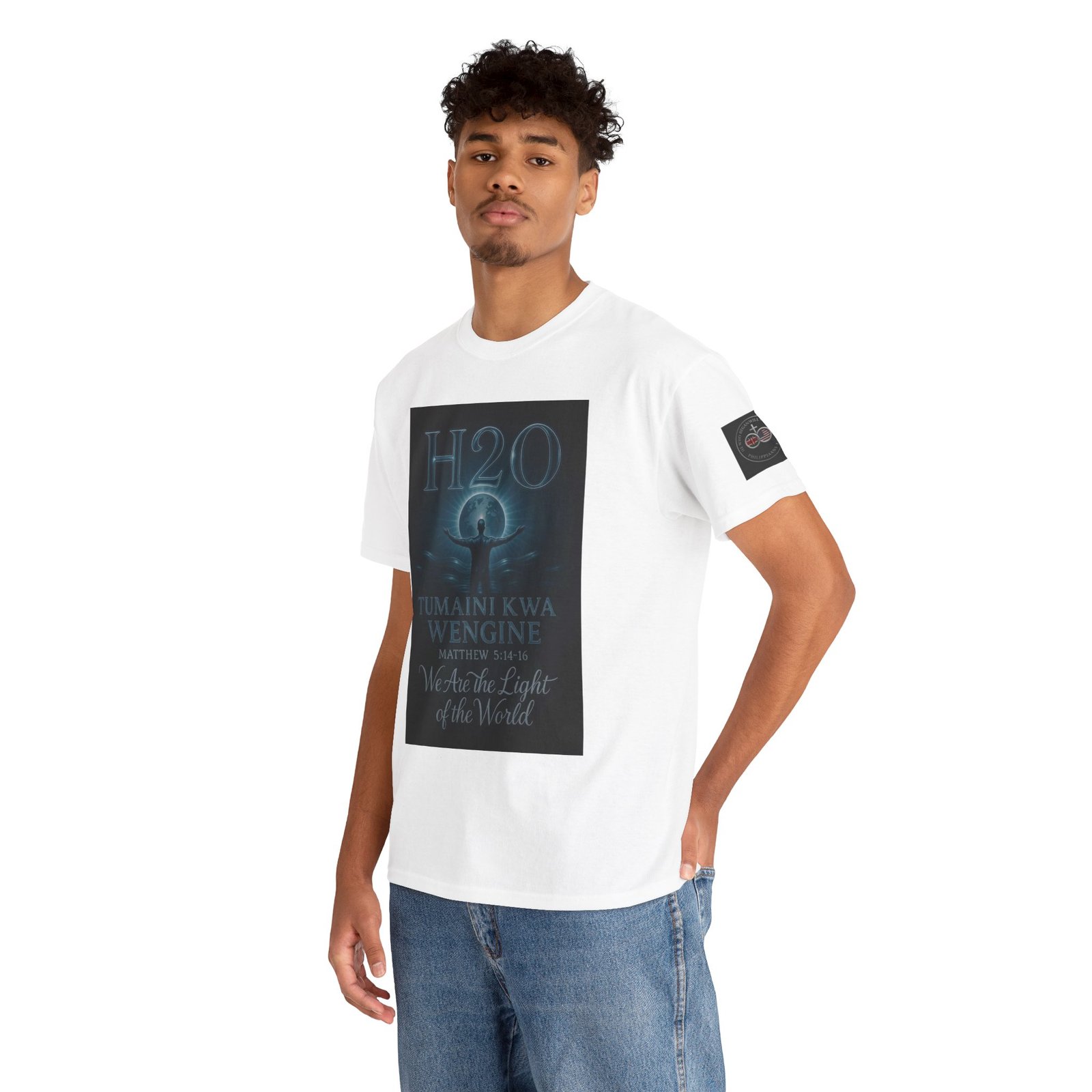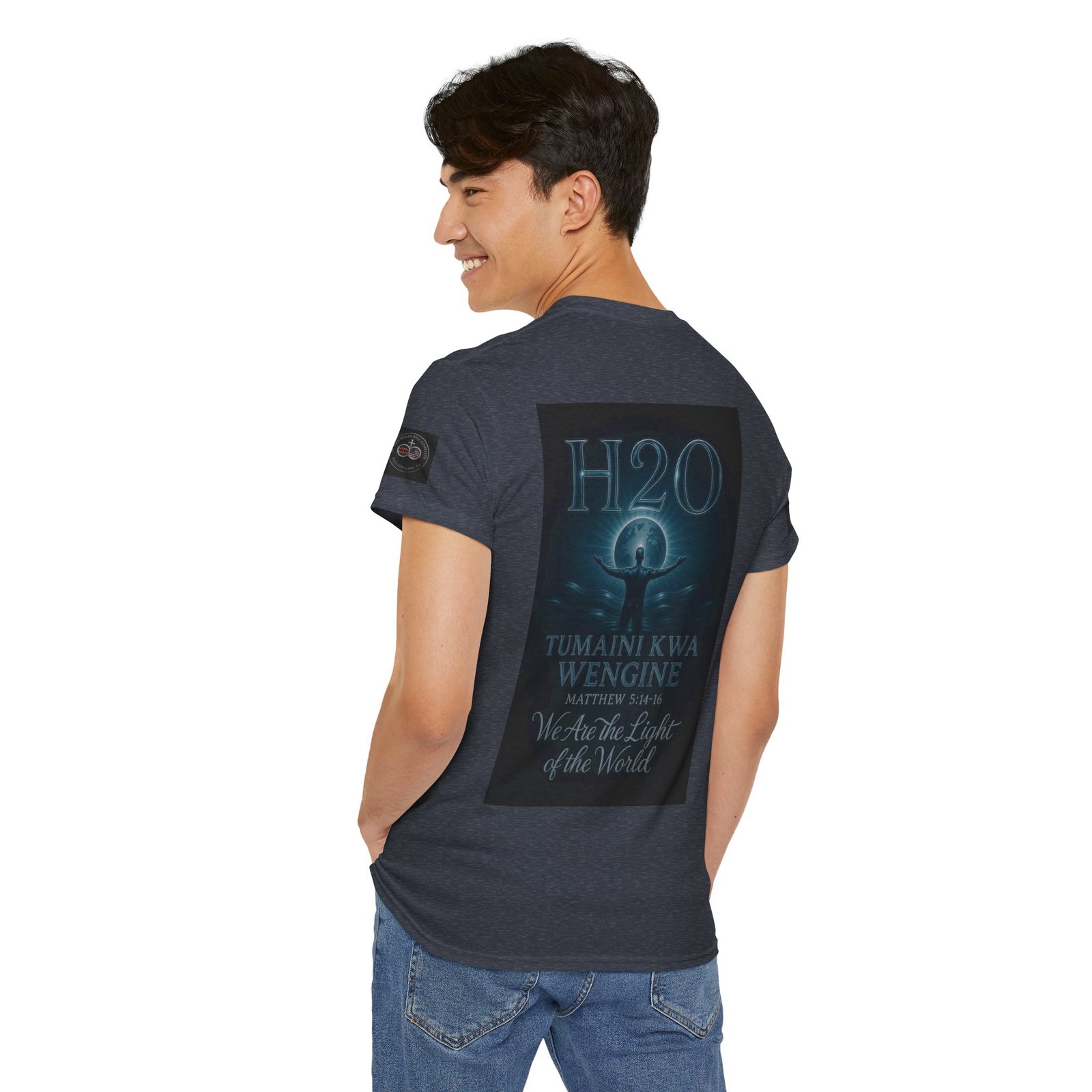 This breathable, classic-fit tee carries a quiet, purposeful message: H2O and a call to be “the light of the world.” The soft, slightly textured cotton feels substantial without weighing you down. A deep, blue-toned poster-style print sits front and center, with the same artwork echoed on the back — a subtle echo for anyone who lives by values and wants their clothing to speak without shouting. Wear it layered under a jacket for evening outreach or on warm days when you want a comfortable shirt that reflects conviction and calm. The clean crewneck and tear-away label keep the focus on the message and the moment, not on fussing with your clothes.