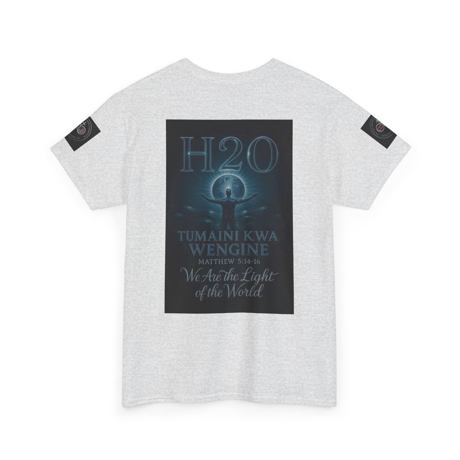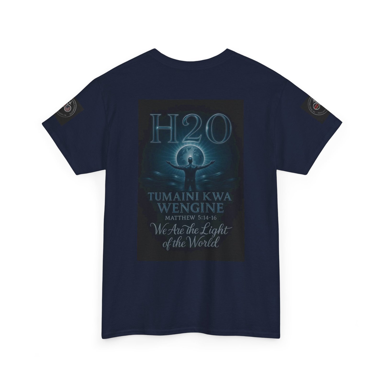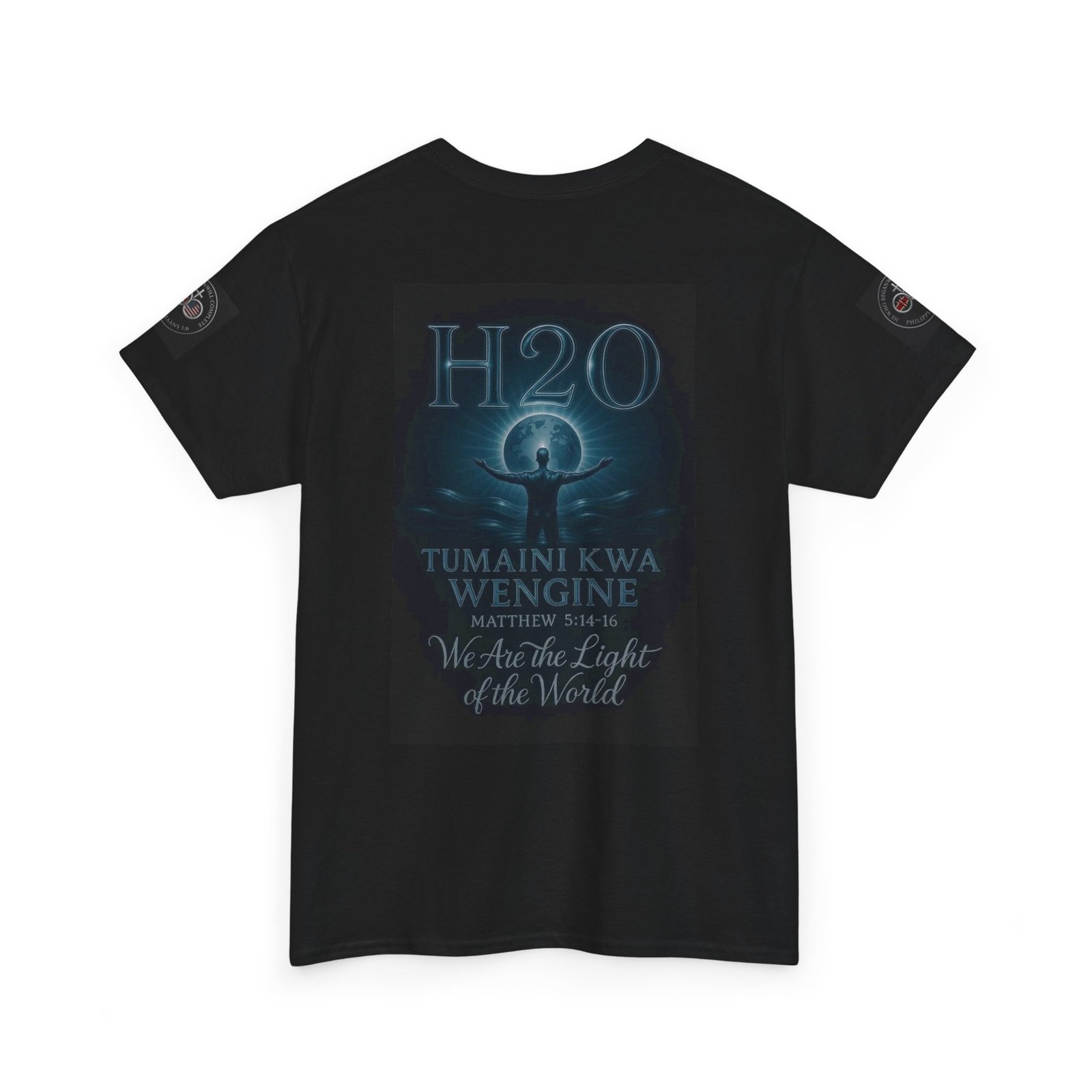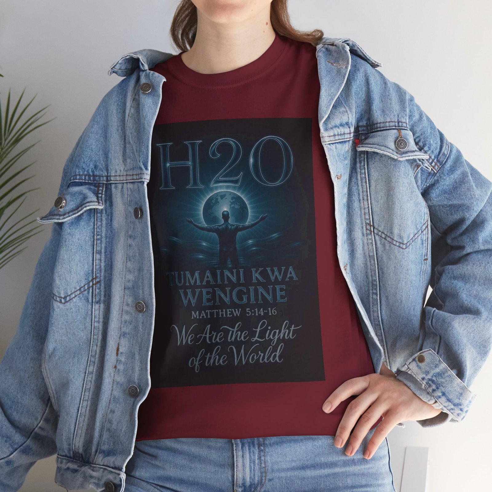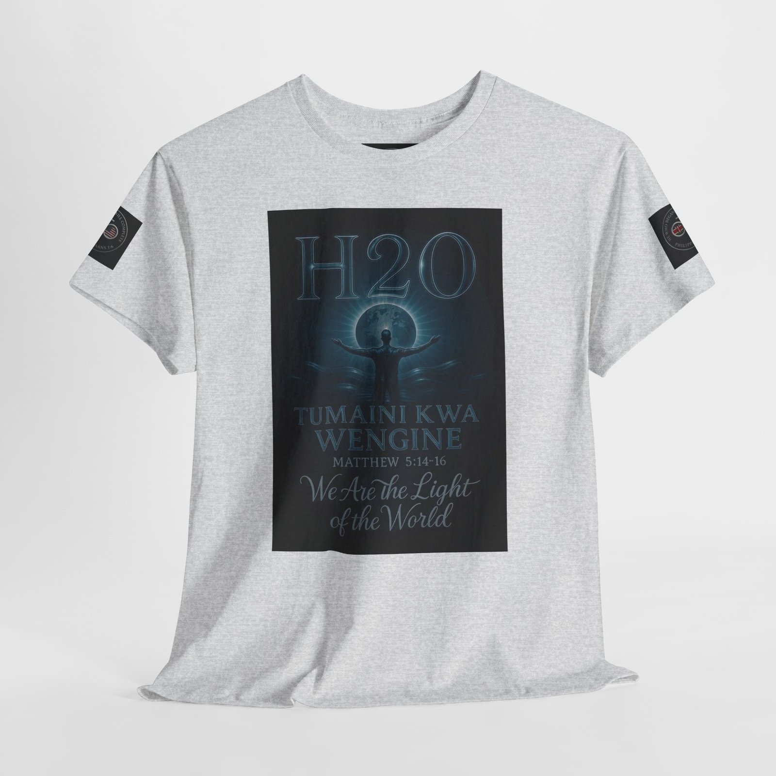 This breathable, classic-fit tee carries a quiet, purposeful message: H2O and a call to be “the light of the world.” The soft, slightly textured cotton feels substantial without weighing you down. A deep, blue-toned poster-style print sits front and center, with the same artwork echoed on the back — a subtle echo for anyone who lives by values and wants their clothing to speak without shouting. Wear it layered under a jacket for evening outreach or on warm days when you want a comfortable shirt that reflects conviction and calm. The clean crewneck and tear-away label keep the focus on the message and the moment, not on fussing with your clothes.
