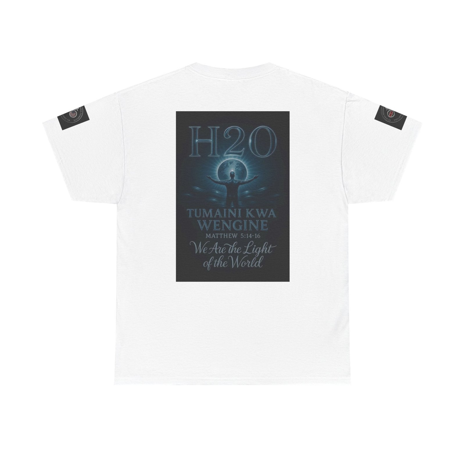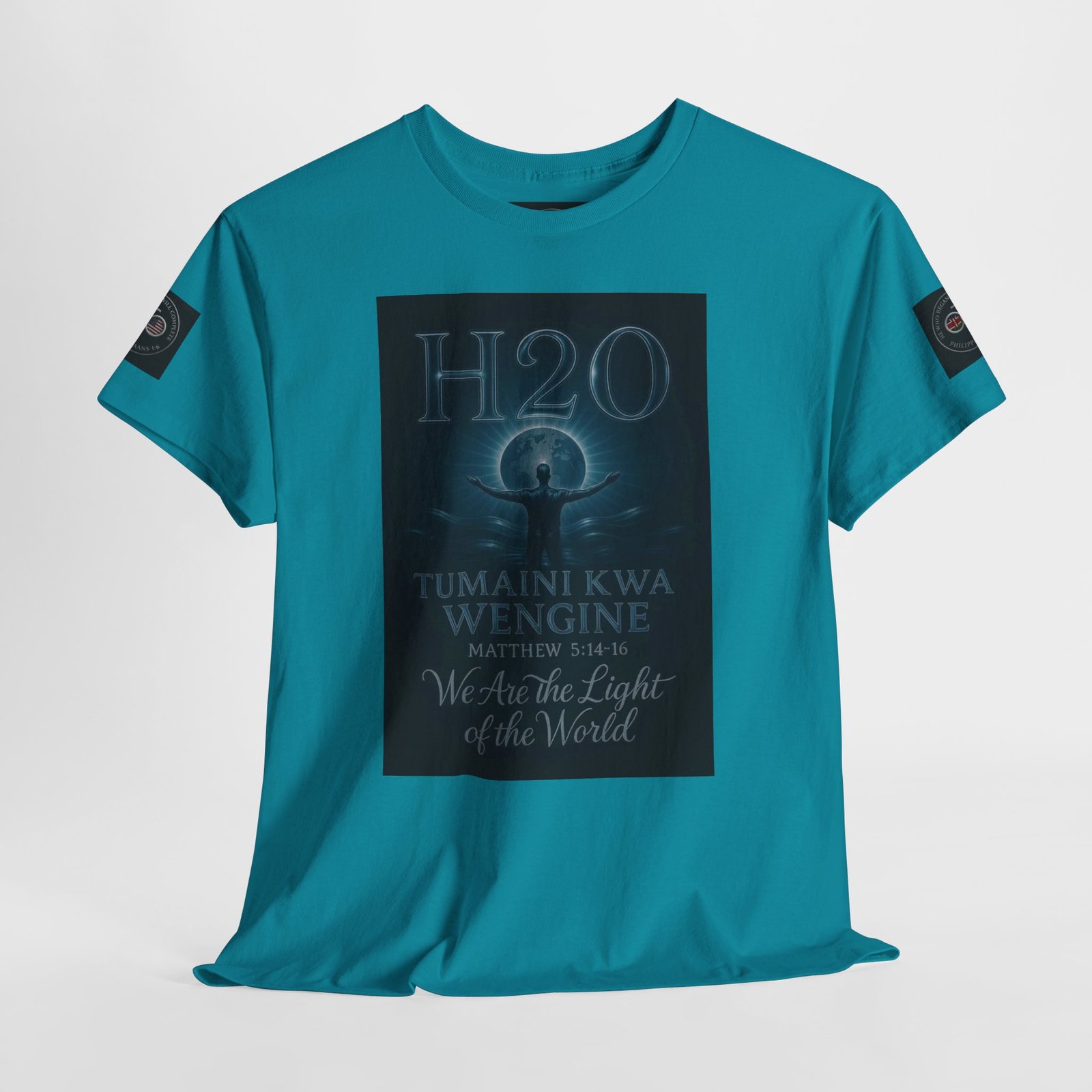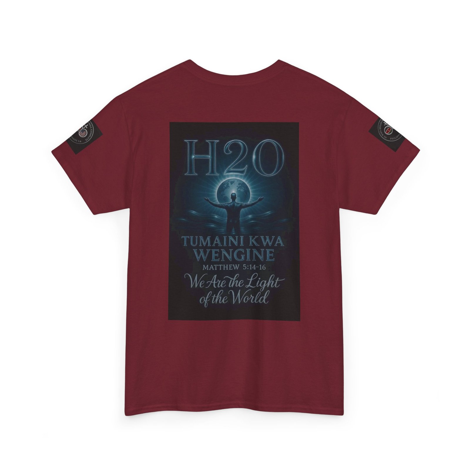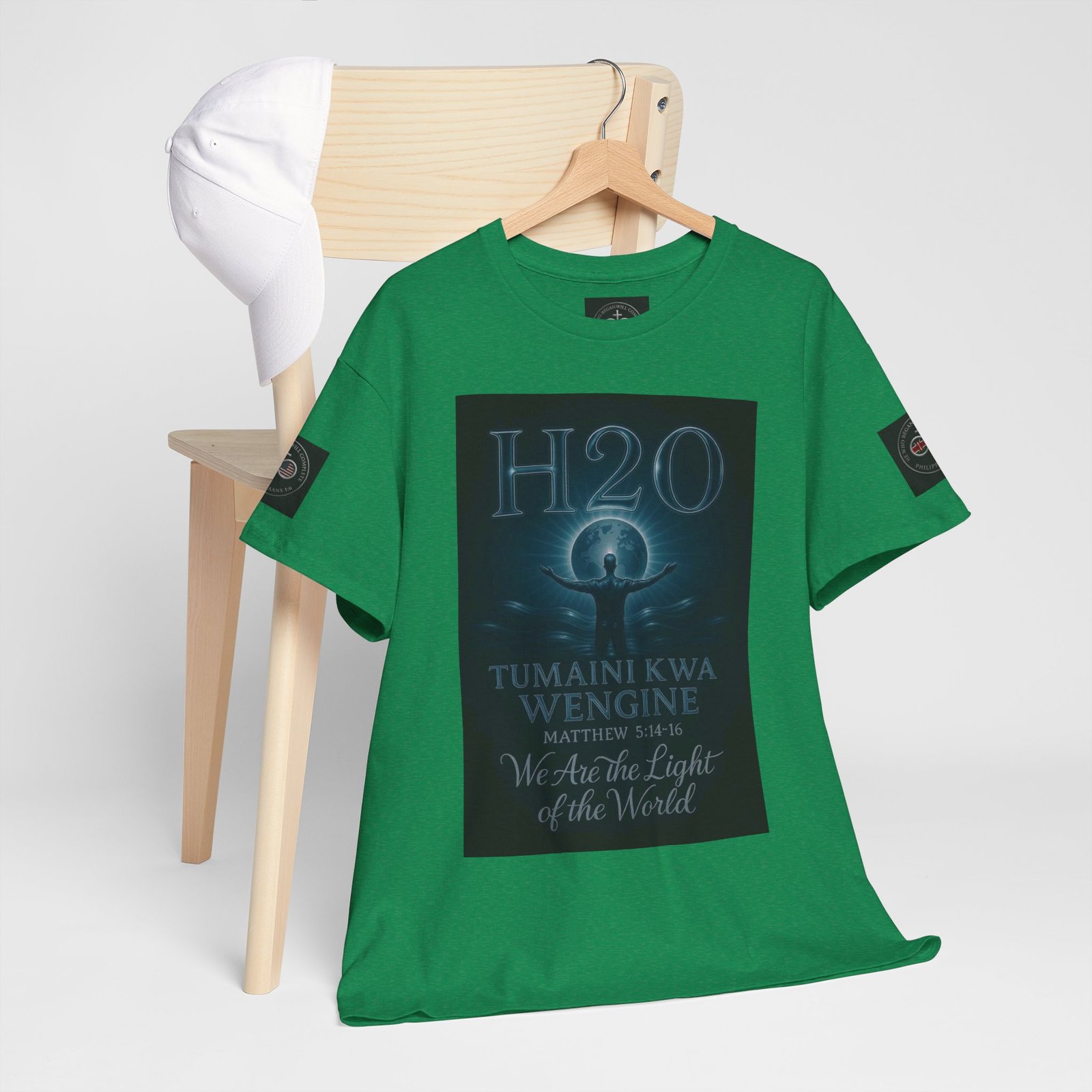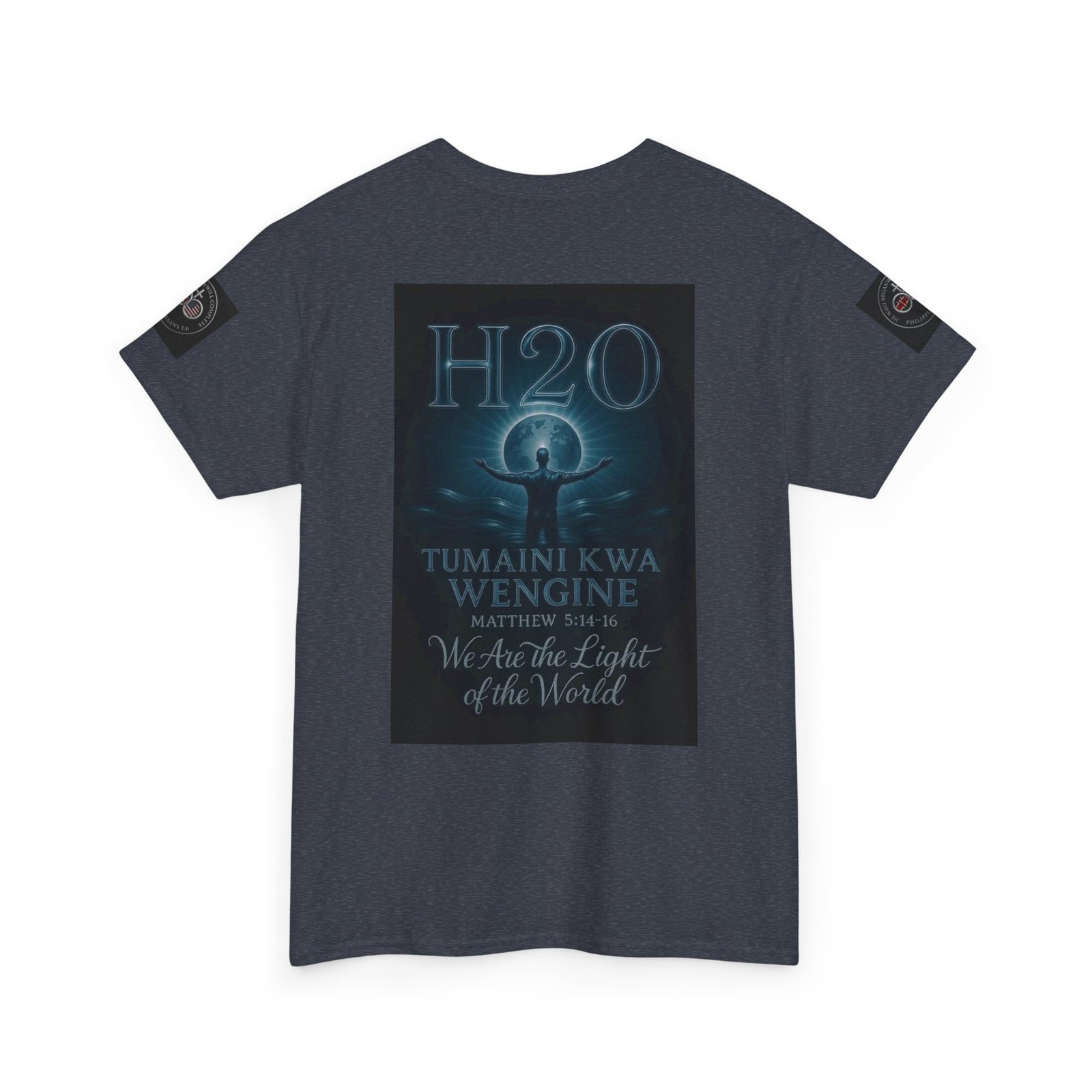 This breathable, classic-fit tee carries a quiet, purposeful message: H2O and a call to be “the light of the world.” The soft, slightly textured cotton feels substantial without weighing you down. A deep, blue-toned poster-style print sits front and center, with the same artwork echoed on the back — a subtle echo for anyone who lives by values and wants their clothing to speak without shouting. Wear it layered under a jacket for evening outreach or on warm days when you want a comfortable shirt that reflects conviction and calm. The clean crewneck and tear-away label keep the focus on the message and the moment, not on fussing with your clothes.