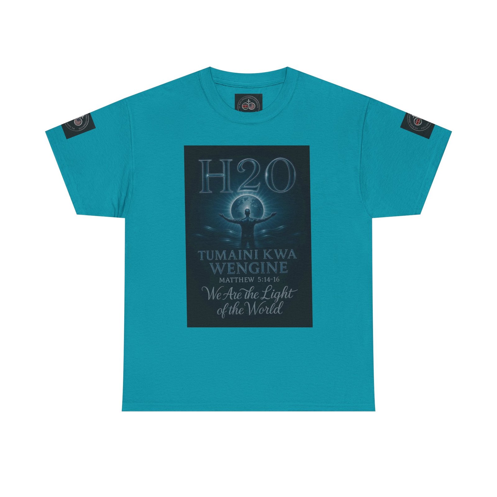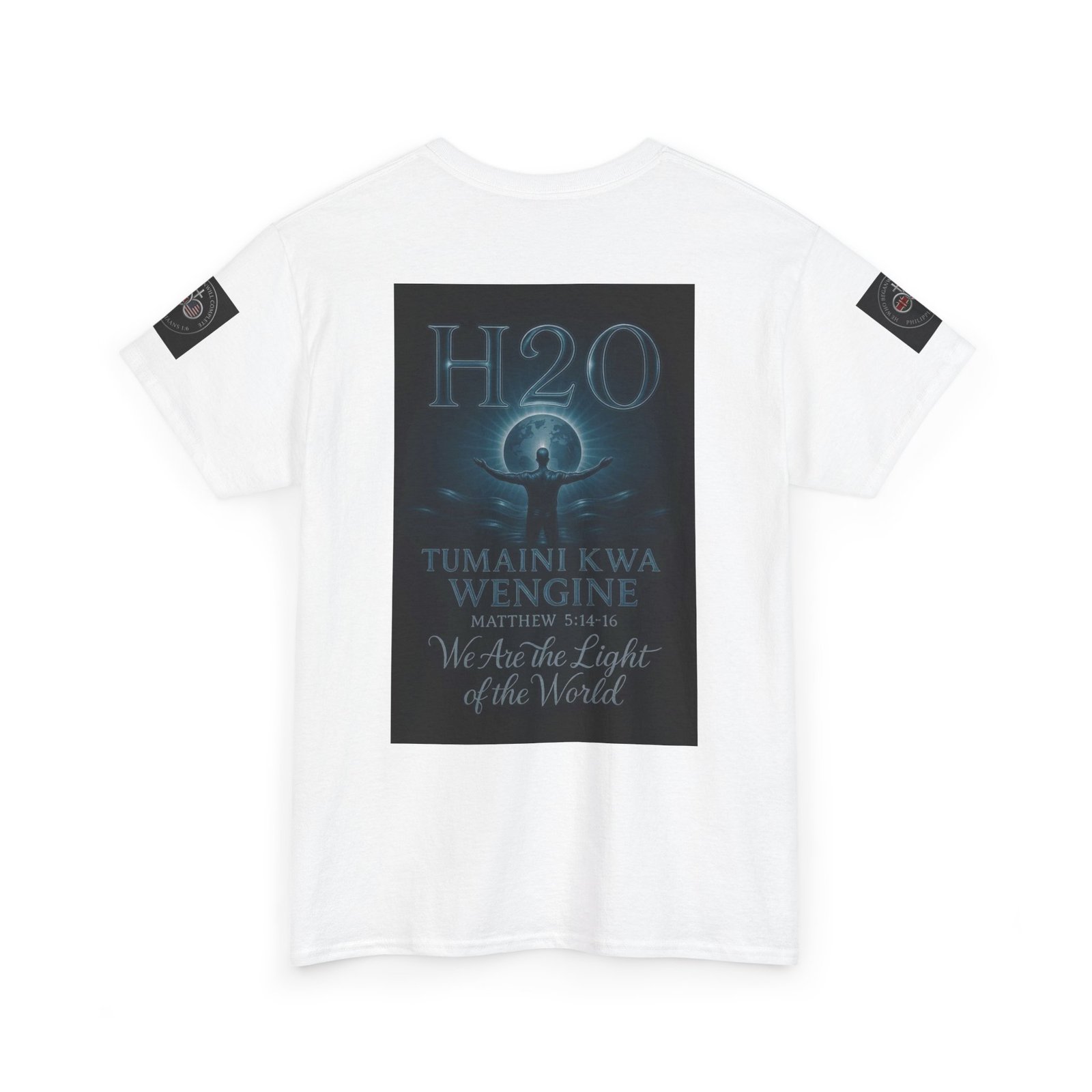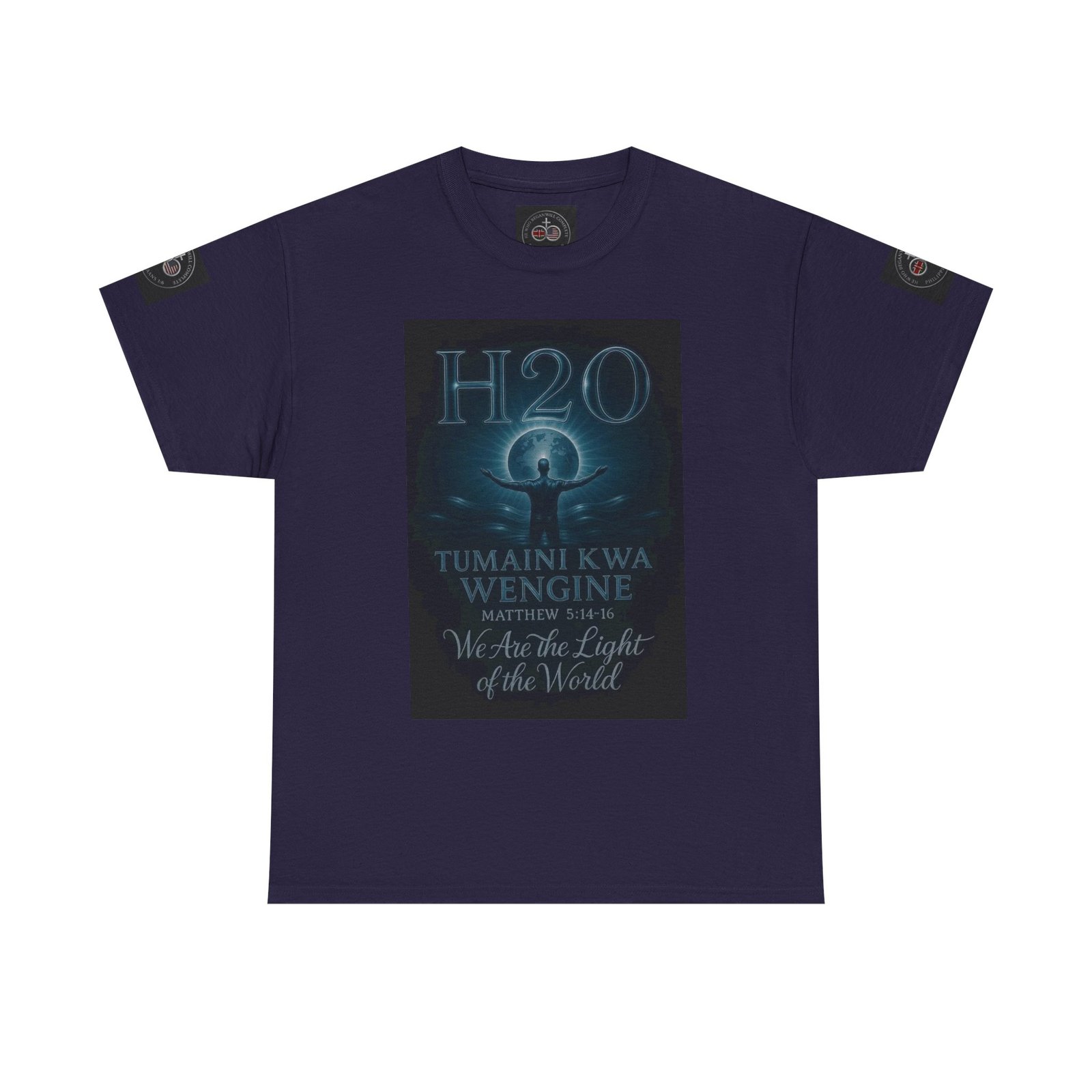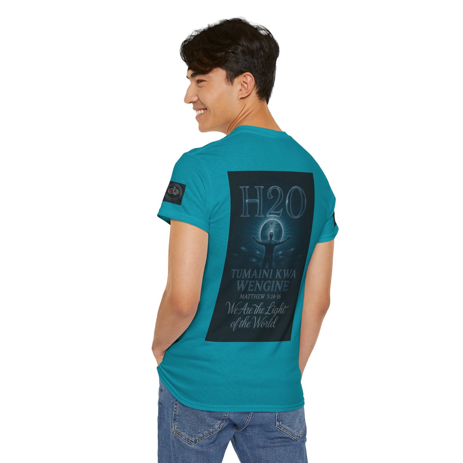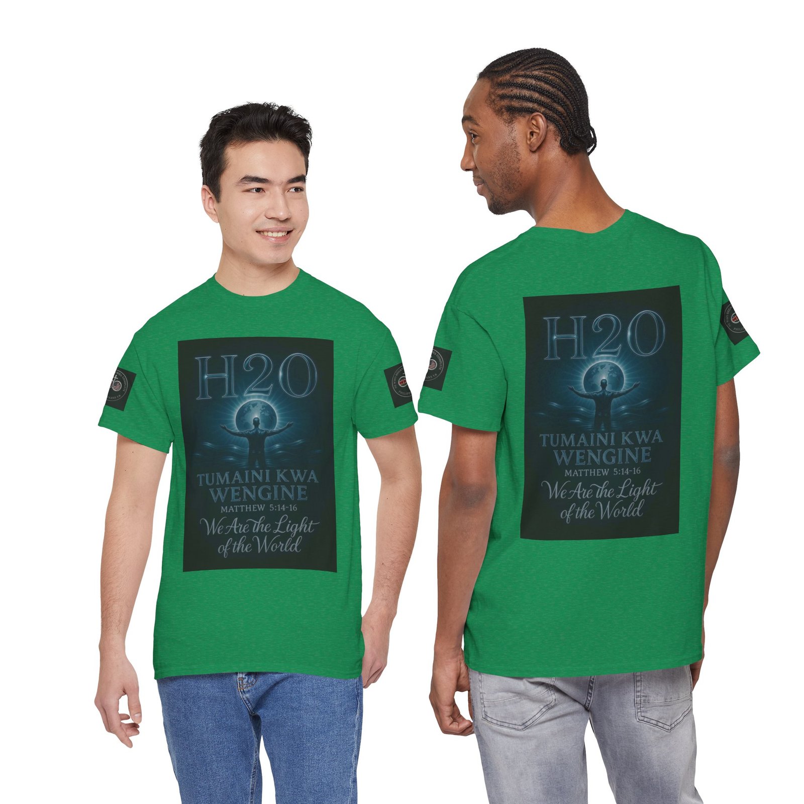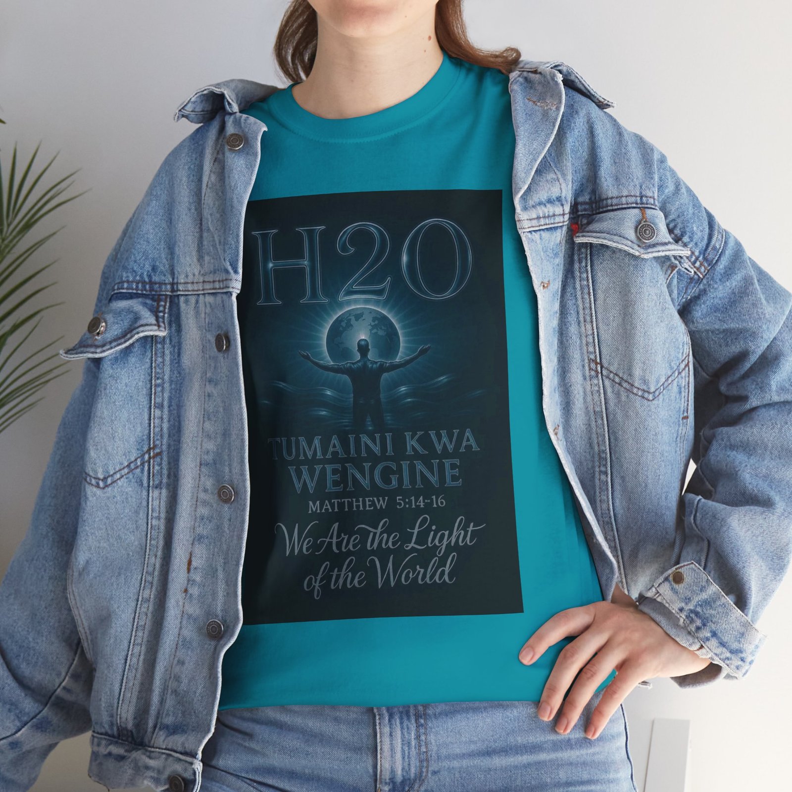 This breathable, classic-fit tee carries a quiet, purposeful message: H2O and a call to be “the light of the world.” The soft, slightly textured cotton feels substantial without weighing you down. A deep, blue-toned poster-style print sits front and center, with the same artwork echoed on the back — a subtle echo for anyone who lives by values and wants their clothing to speak without shouting. Wear it layered under a jacket for evening outreach or on warm days when you want a comfortable shirt that reflects conviction and calm. The clean crewneck and tear-away label keep the focus on the message and the moment, not on fussing with your clothes.
