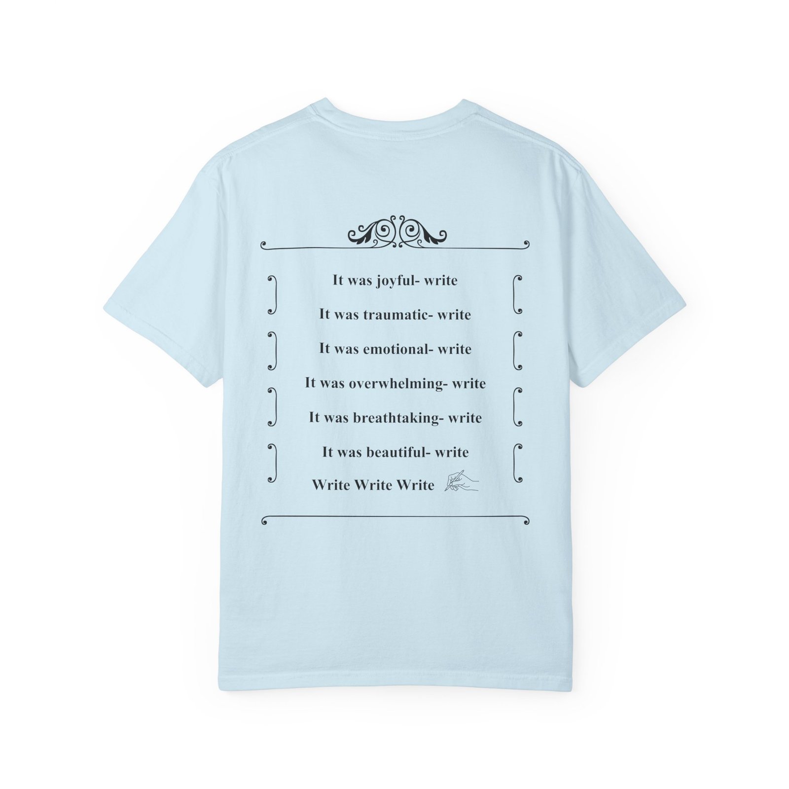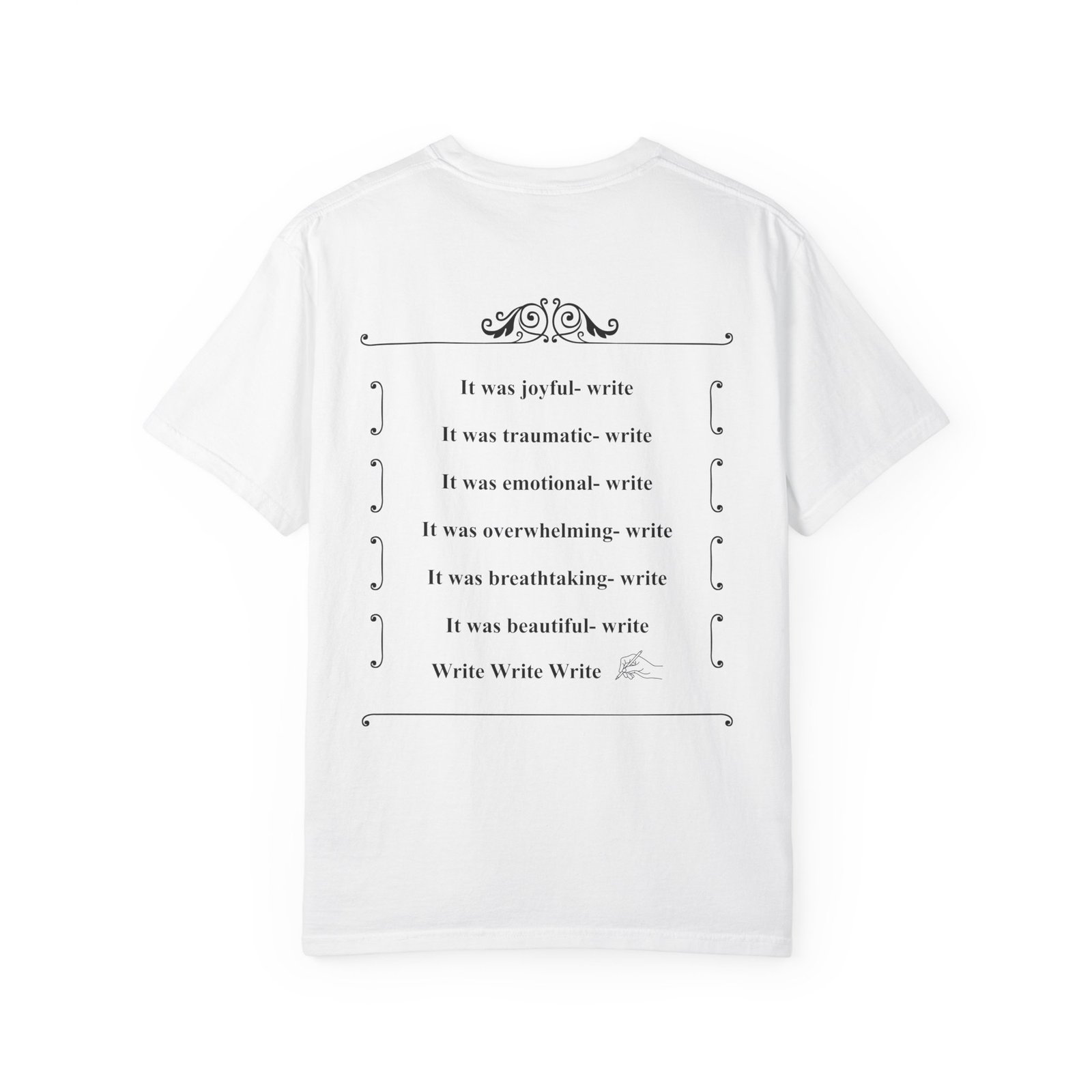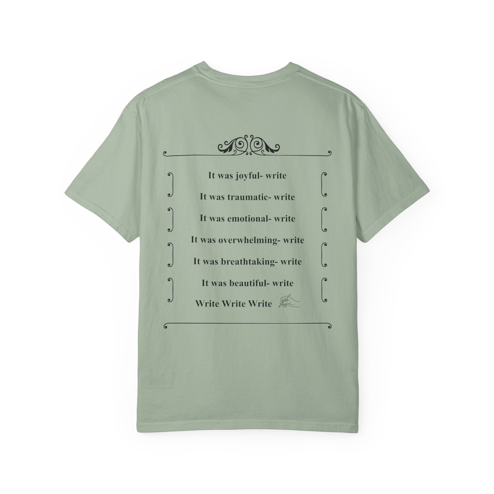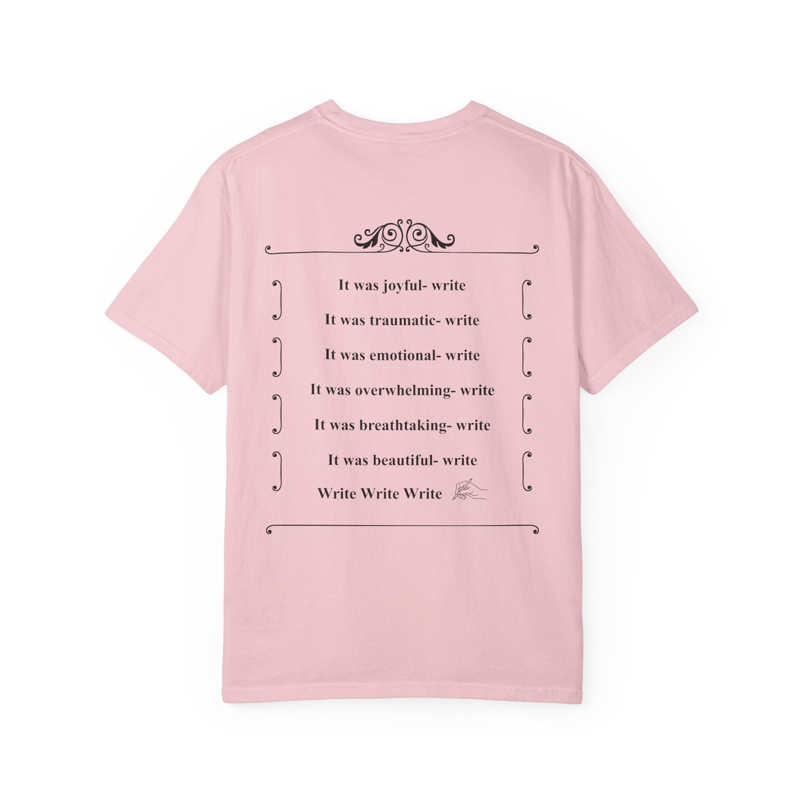 A soft, garment-dyed cotton tee that reads like a quiet prompt for anyone who keeps a notebook nearby. The front carries a small, framed line encouraging rest, courage, and patience; the back opens into a gentle list of writing reminders — short, right-sized nudges to write through joy, trauma, awe, and beauty. The relaxed fit and medium-weight 100% ring-spun cotton feel broken-in from the first wear. Subtle vintage dyeing and tubular construction give the tee a lived-in look without added side seams. Wear it to a coffee shop writing session, an evening of journaling, or when you need a calm, wearable invitation to put pen to paper.