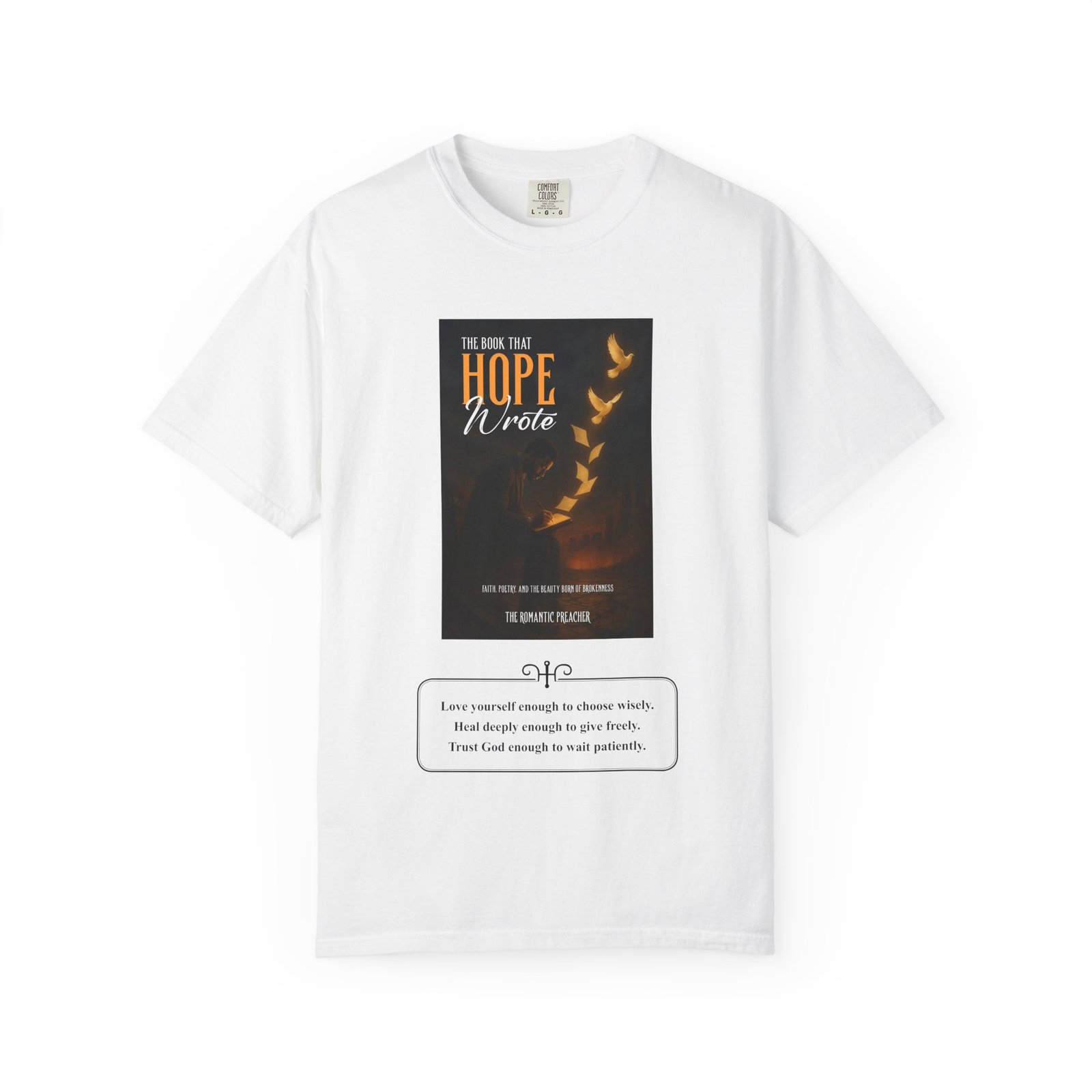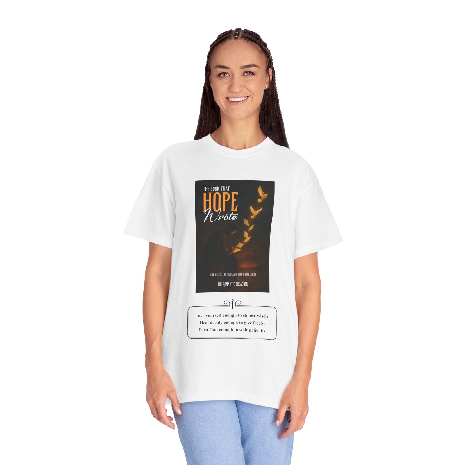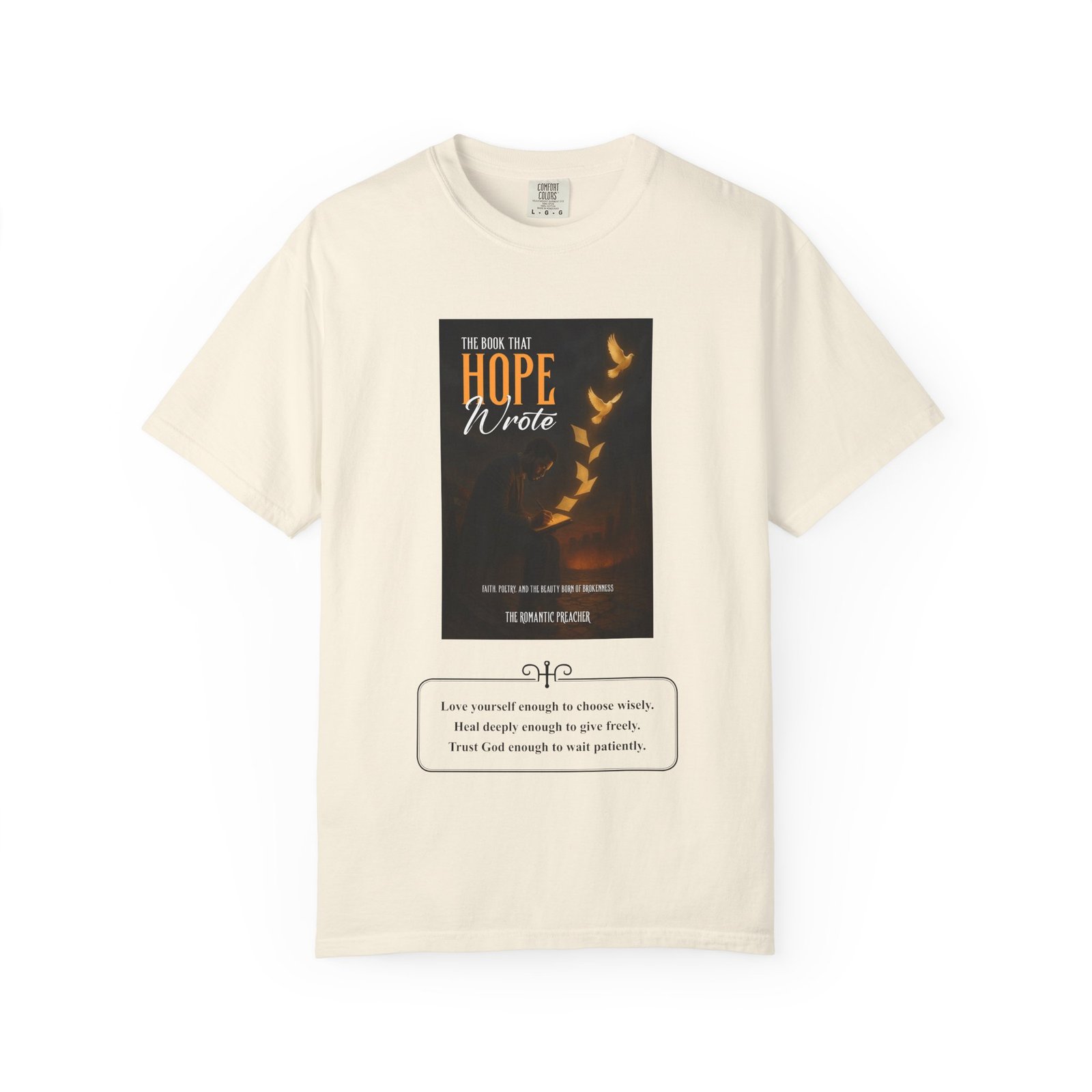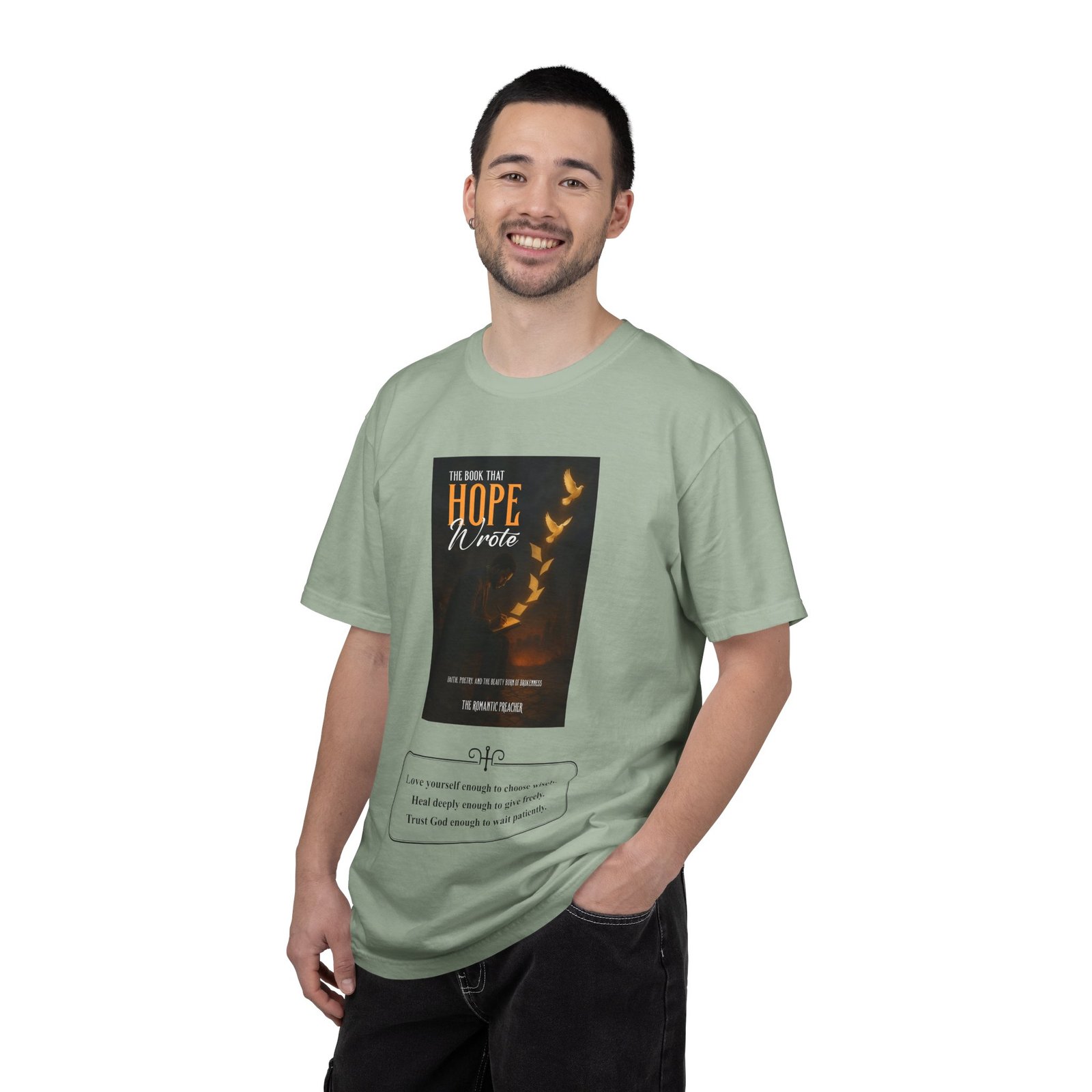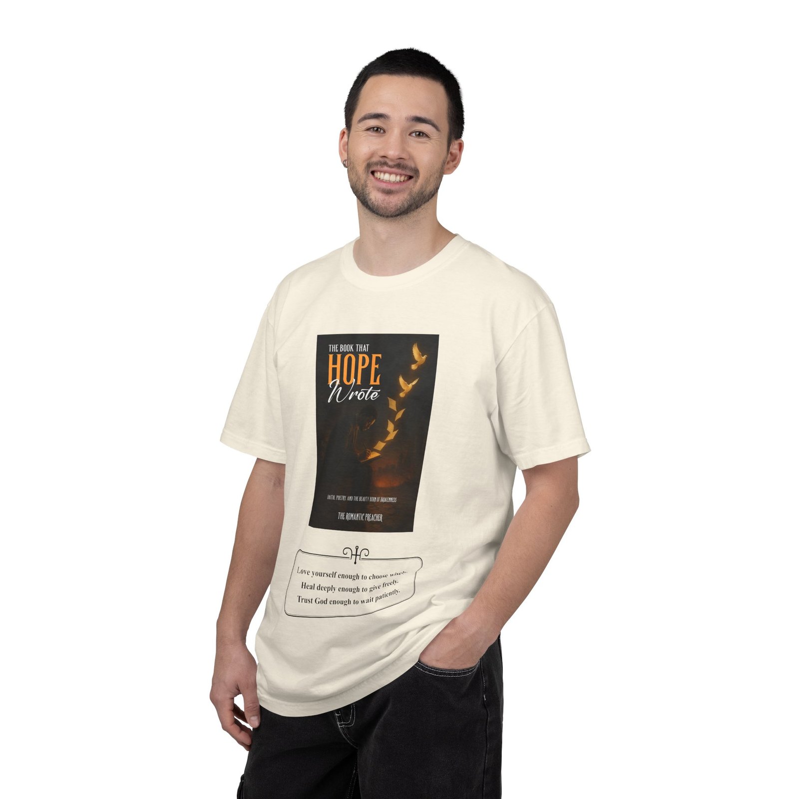 A soft, garment-dyed cotton tee that reads like a quiet prompt for anyone who keeps a notebook nearby. The front carries a small, framed line encouraging rest, courage, and patience; the back opens into a gentle list of writing reminders — short, right-sized nudges to write through joy, trauma, awe, and beauty. The relaxed fit and medium-weight 100% ring-spun cotton feel broken-in from the first wear. Subtle vintage dyeing and tubular construction give the tee a lived-in look without added side seams. Wear it to a coffee shop writing session, an evening of journaling, or when you need a calm, wearable invitation to put pen to paper.
