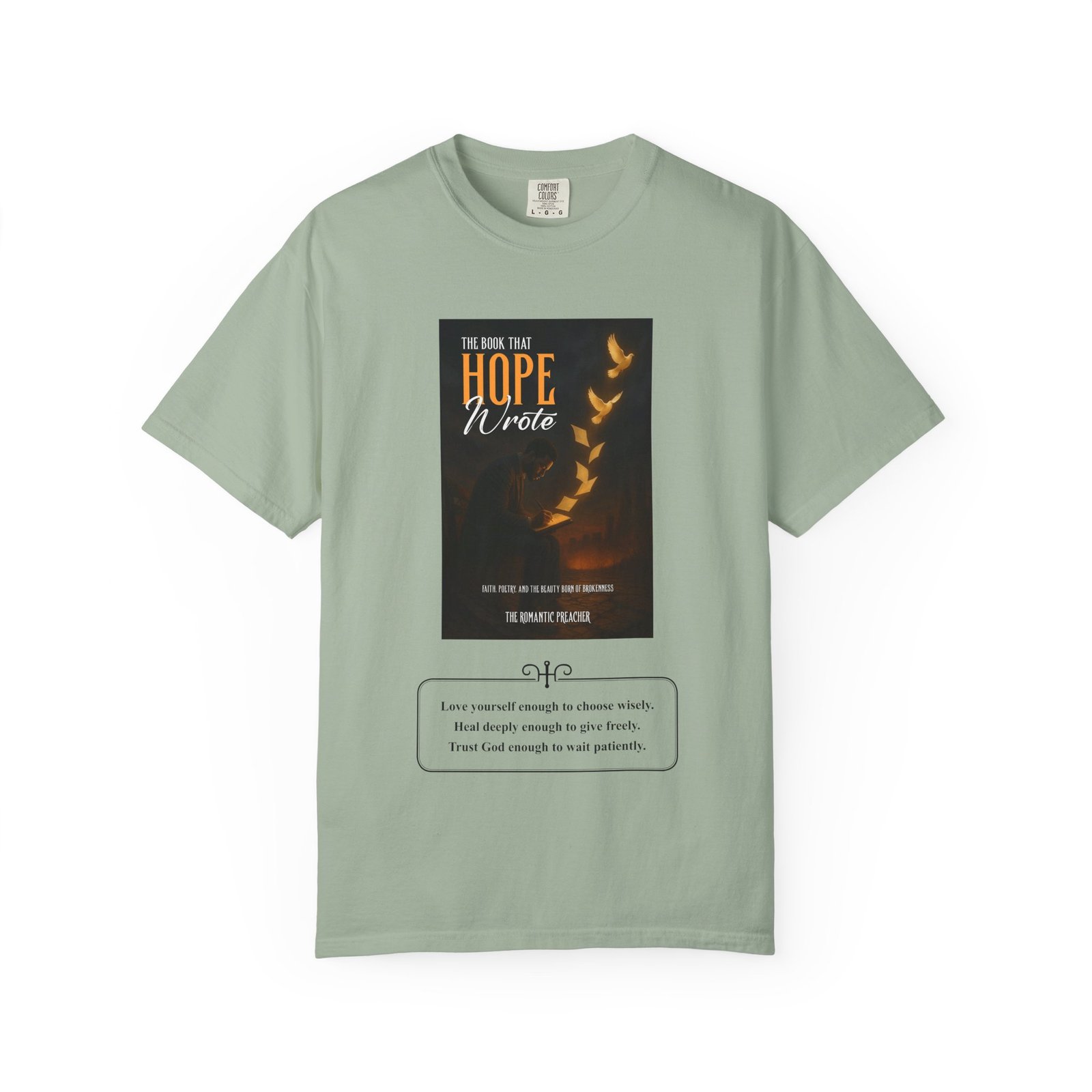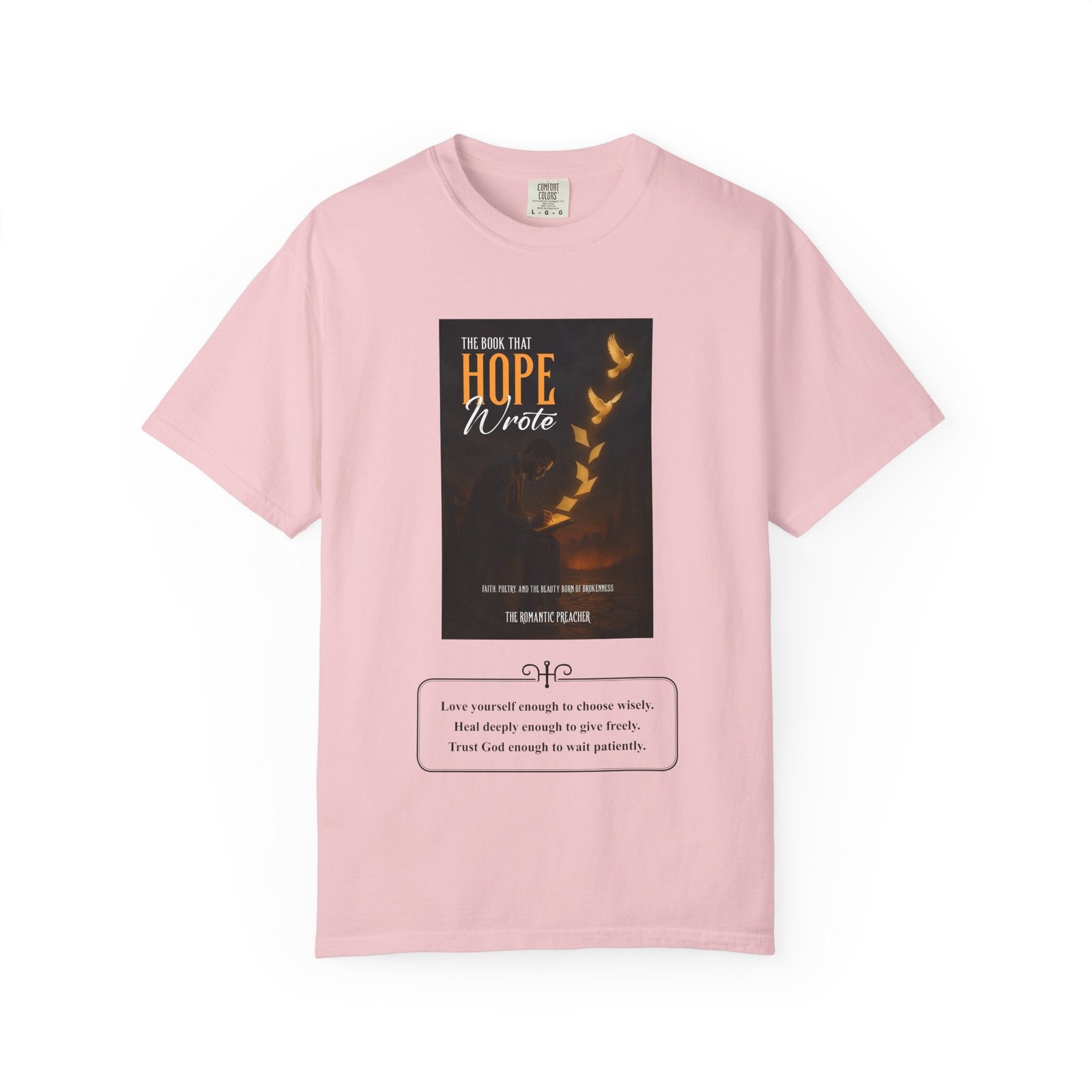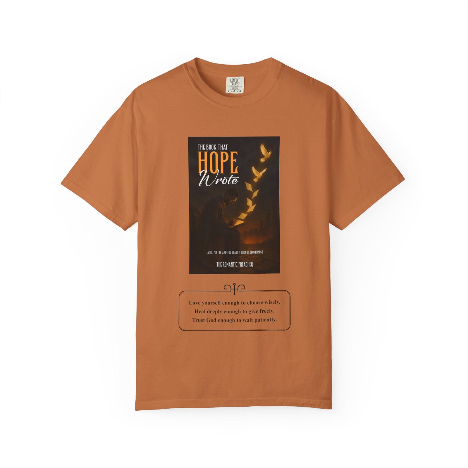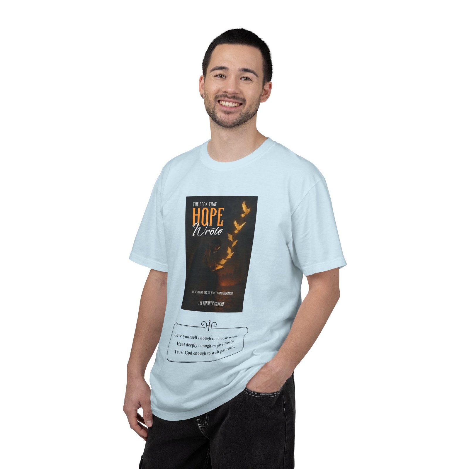 A soft, garment-dyed cotton tee that reads like a quiet prompt for anyone who keeps a notebook nearby. The front carries a small, framed line encouraging rest, courage, and patience; the back opens into a gentle list of writing reminders — short, right-sized nudges to write through joy, trauma, awe, and beauty. The relaxed fit and medium-weight 100% ring-spun cotton feel broken-in from the first wear. Subtle vintage dyeing and tubular construction give the tee a lived-in look without added side seams. Wear it to a coffee shop writing session, an evening of journaling, or when you need a calm, wearable invitation to put pen to paper.